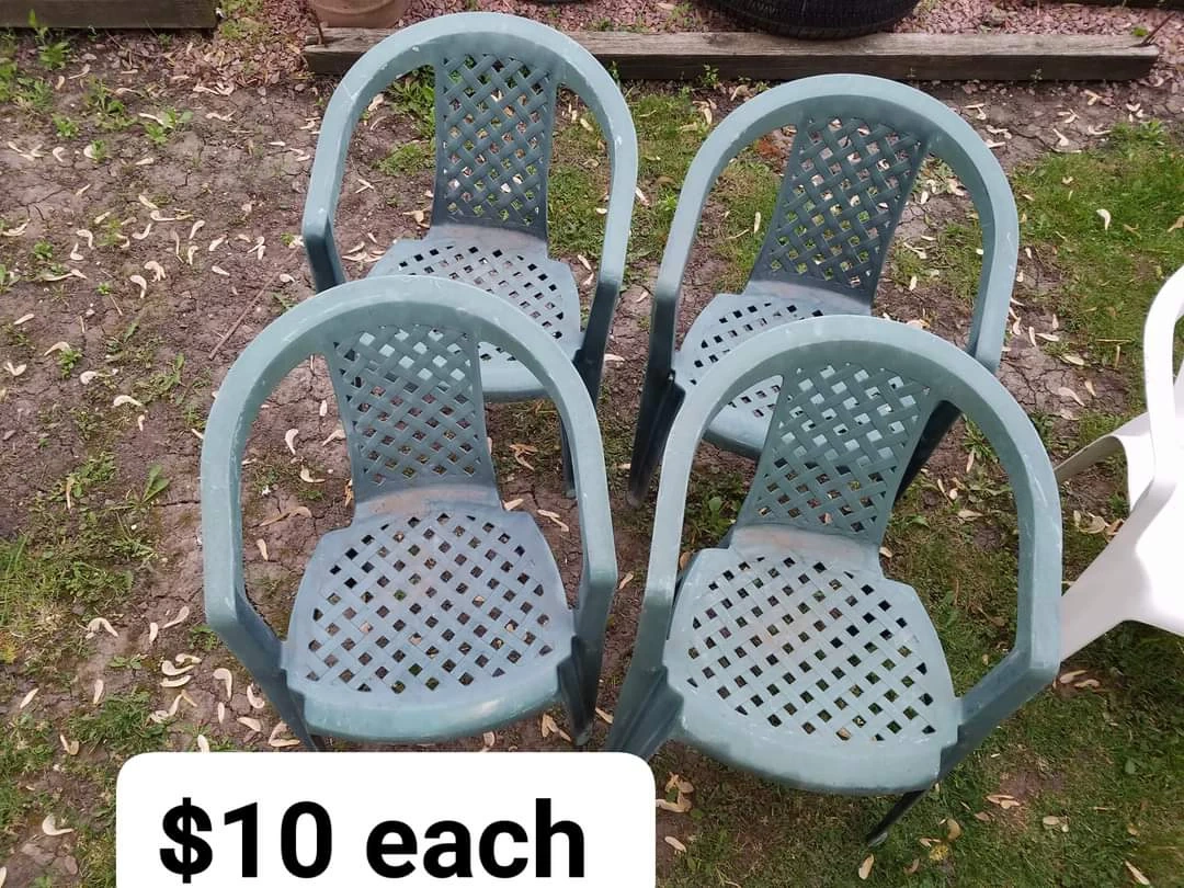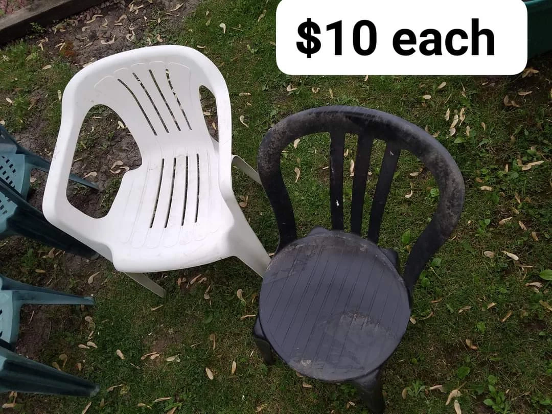 plastic chairs, great for outdoor use. Various colors available: white, black, and green. Durable and lightweight. Sold individually. $10 each
