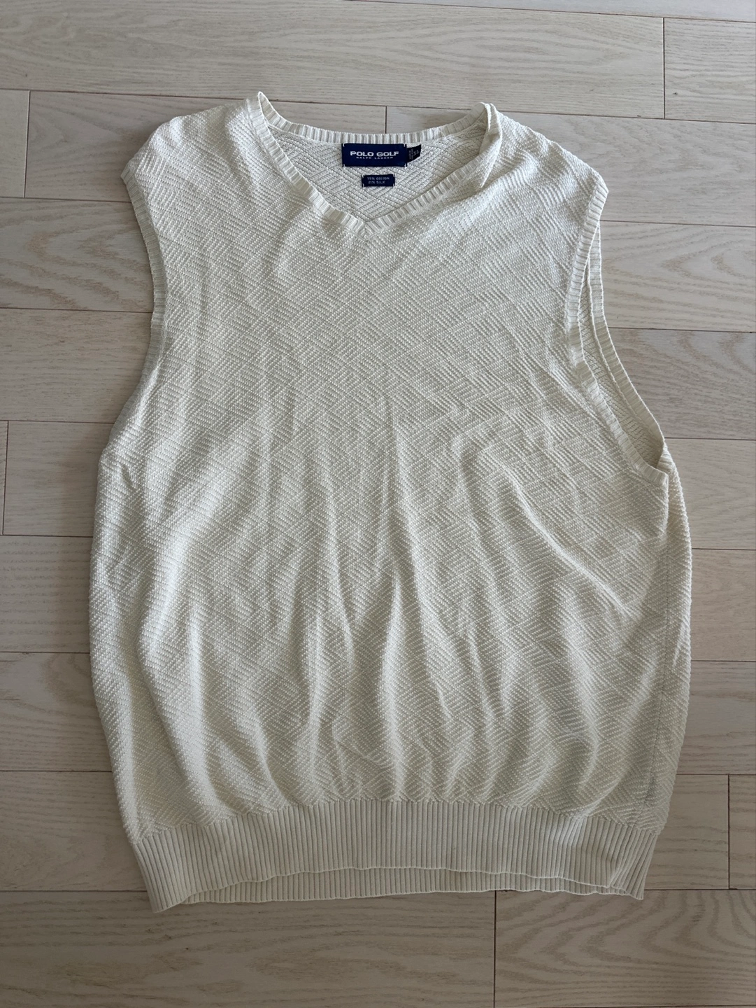 Vintage Cream-coloured sleeveless knit sweater. V-neck. Herringbone pattern. Looks great layered. Excellent condition vintage piece.