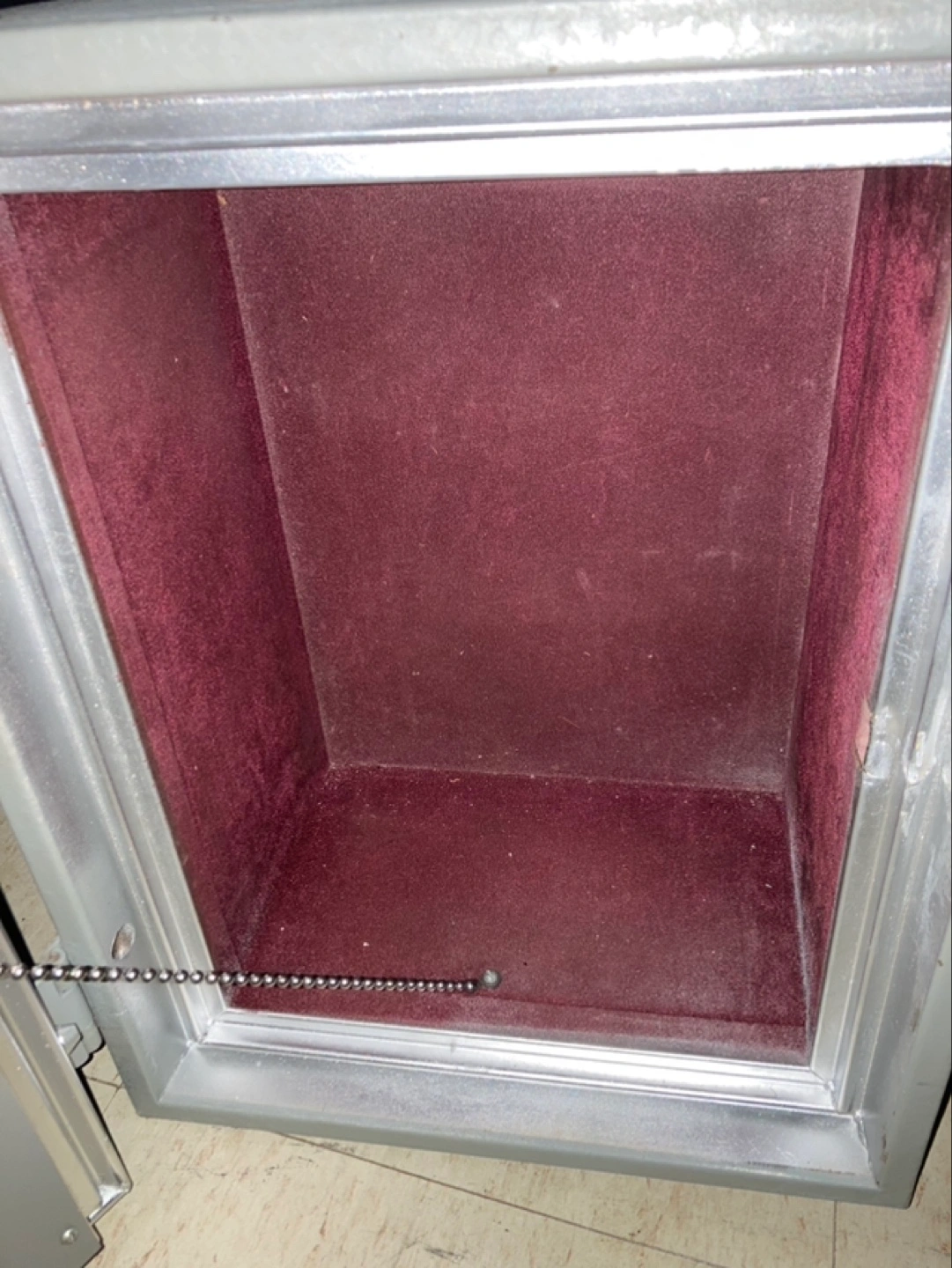 Small gray metal safe. Combination lock. Burgundy interior. Good for valuables.