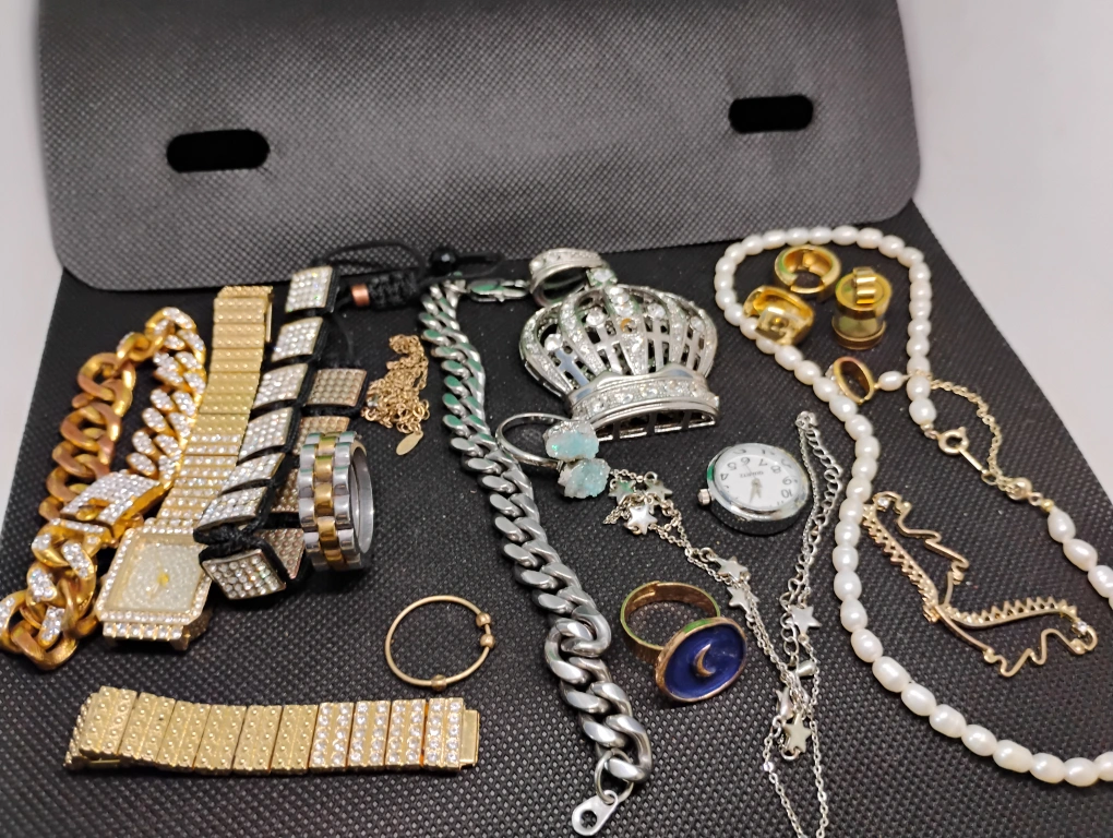 Assortment of women's jewelry. Includes several bracelets, necklaces, rings, and watches. Various styles and materials. Gold and silver tones. Some pieces feature crystals or rhinestones. Pearl necklace included.