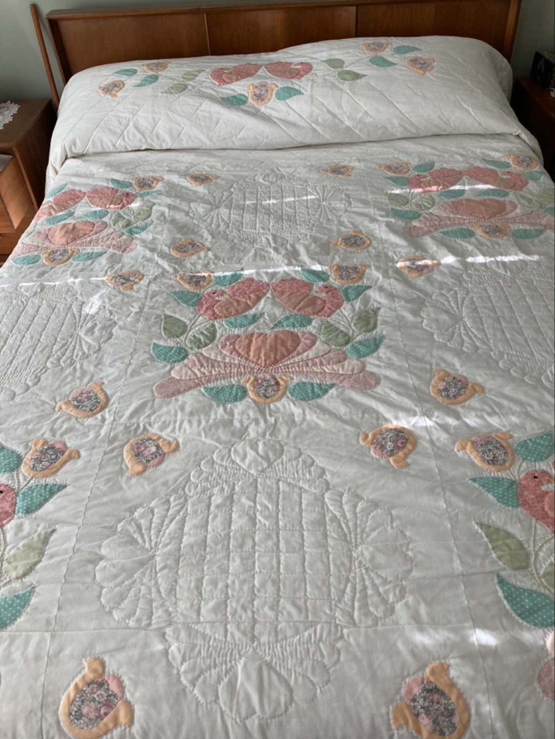 Beautiful handmade quilt. Features a floral design in pastel colors. Soft cotton fabric. Excellent condition.Regular Size
