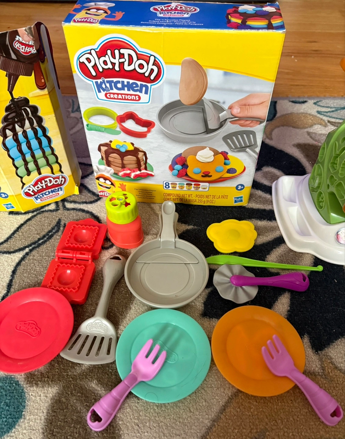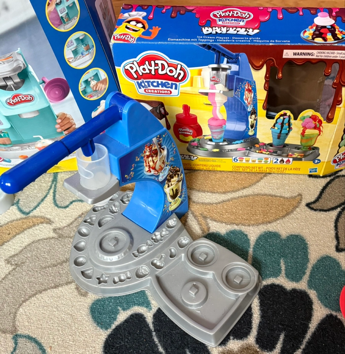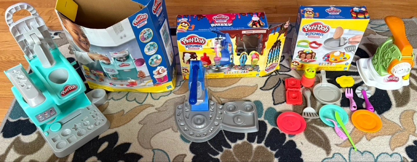 Used Play-Doh Kitchen Creations bundle. Includes a cappuccino machine, ice cream maker, pancake maker, and a smaller extruder. Might need to replace the play doh for new fresh ones. Great for creativity and fun !