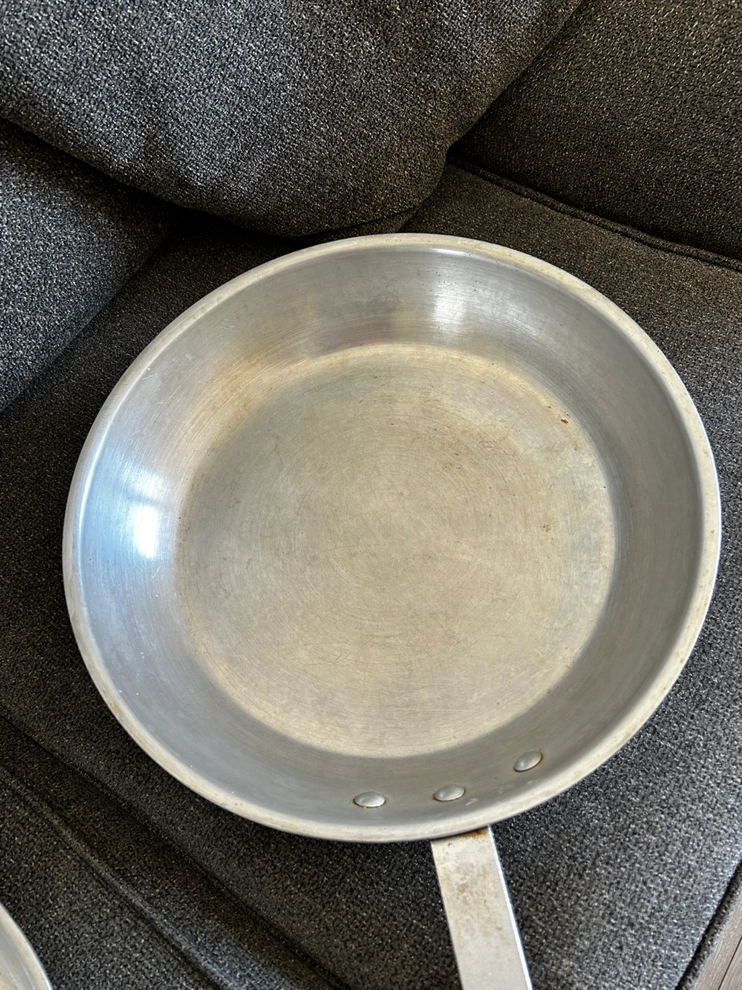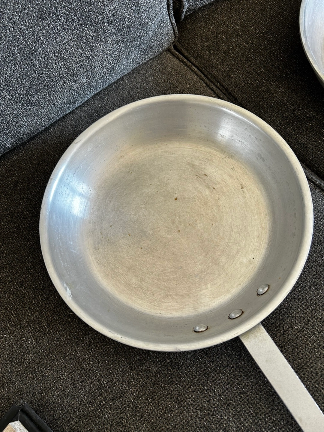 Pre-owned aluminum frying pan. Features a riveted handle. Shows some signs of use. $10 for both they are clean on the inside.