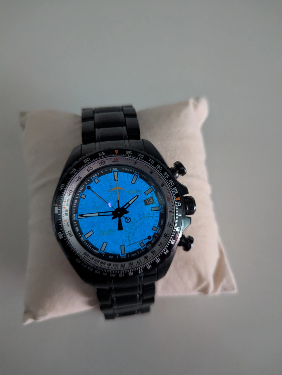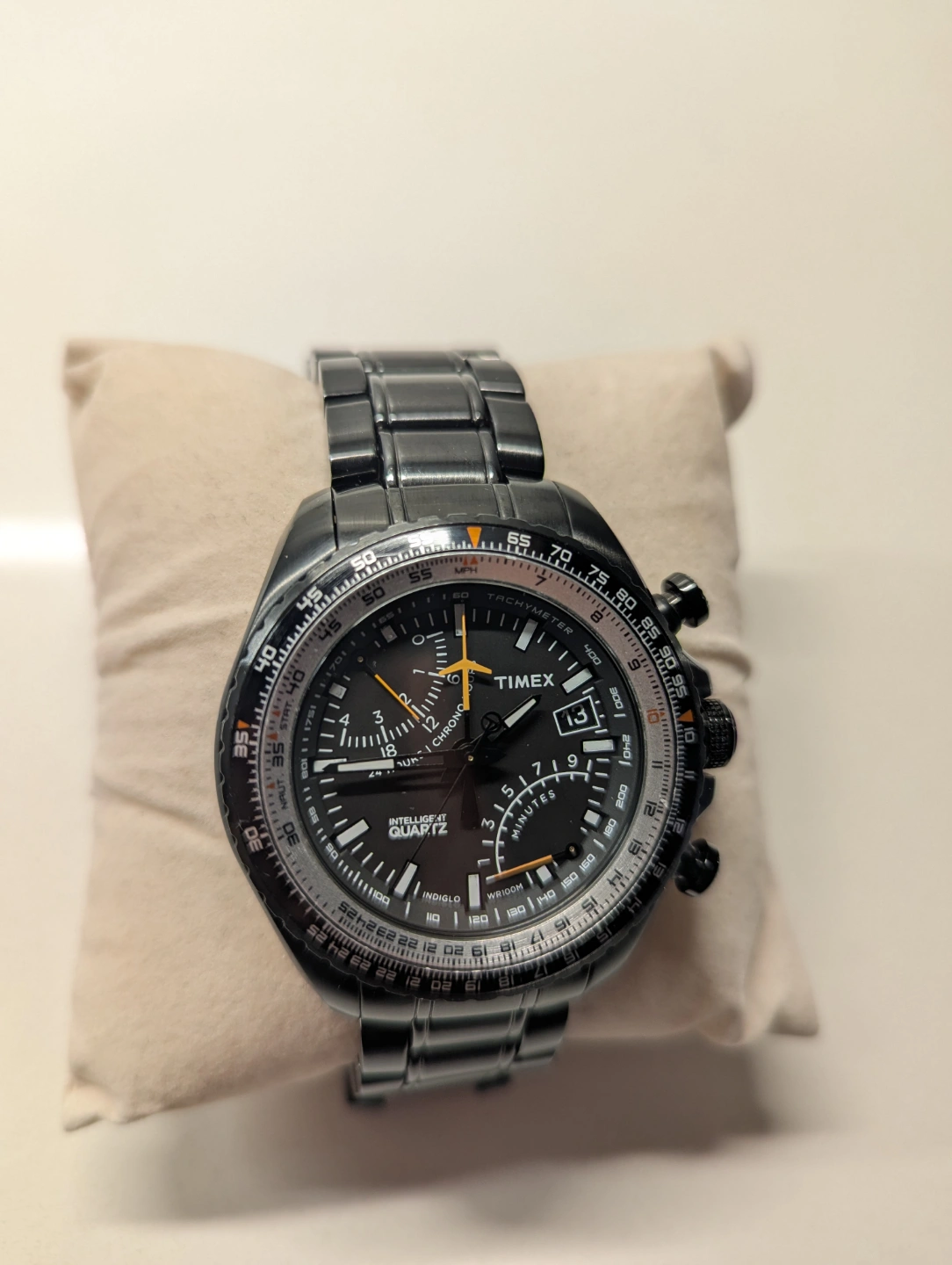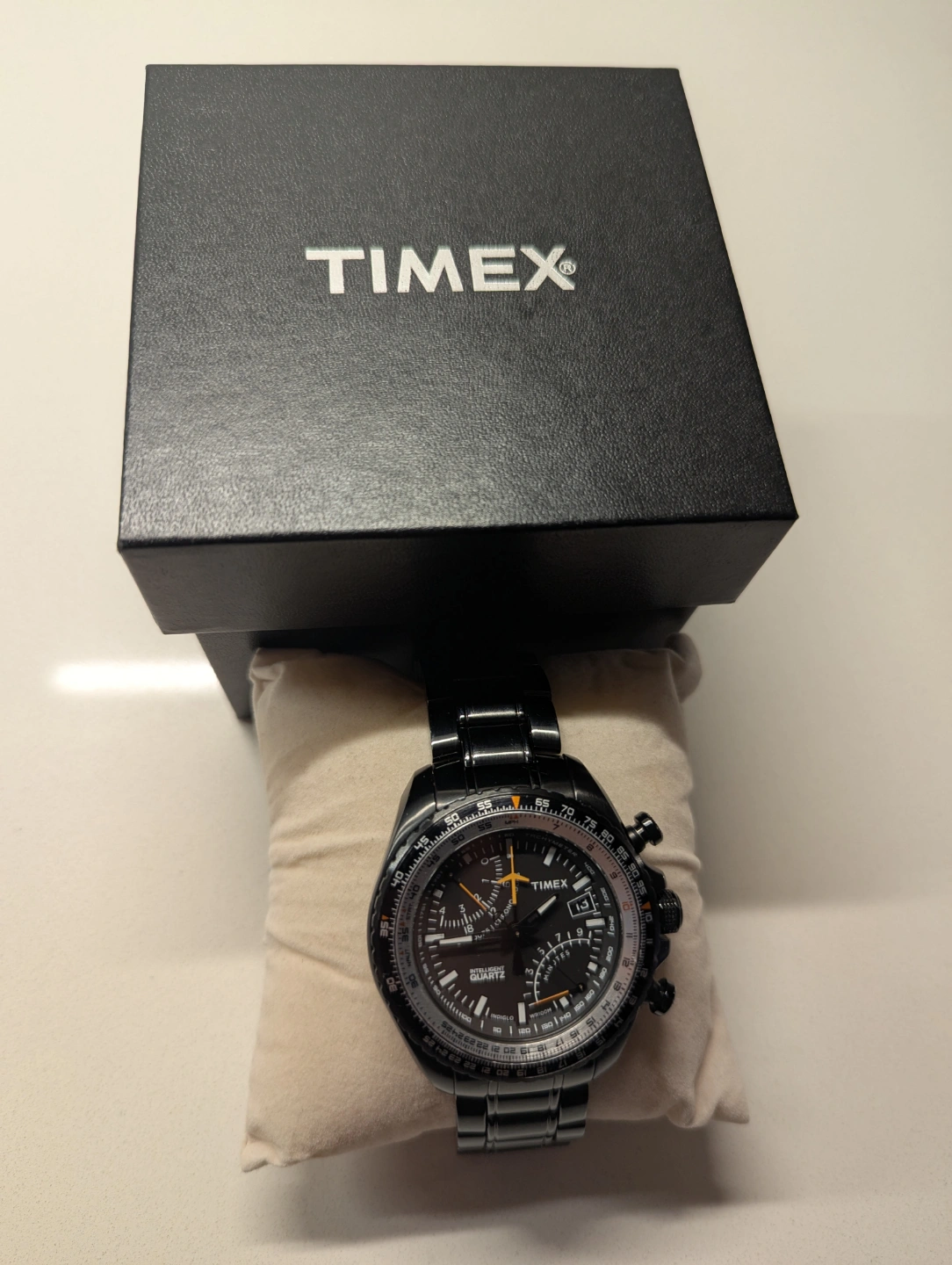 Men's Timex watch. Black stainless steel band. Quartz movement. Rotating bezel. Chronograph features and 24 hour clock indicator. Comes with original box.