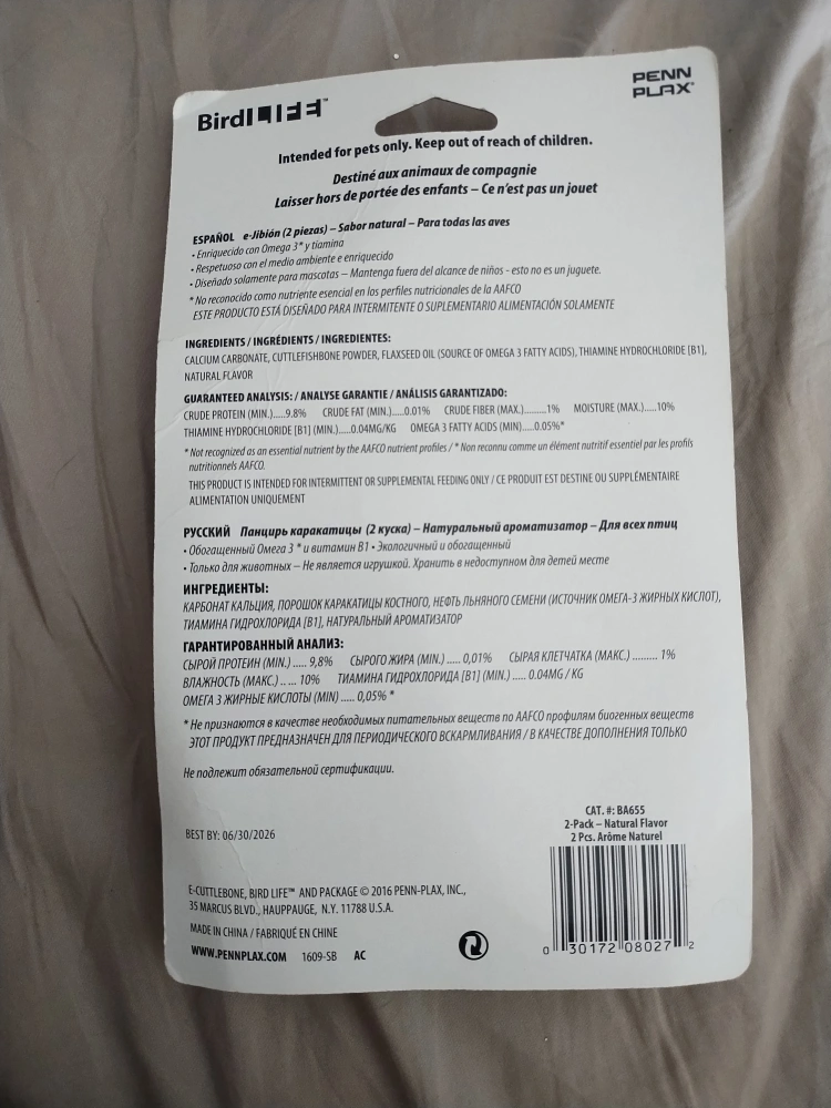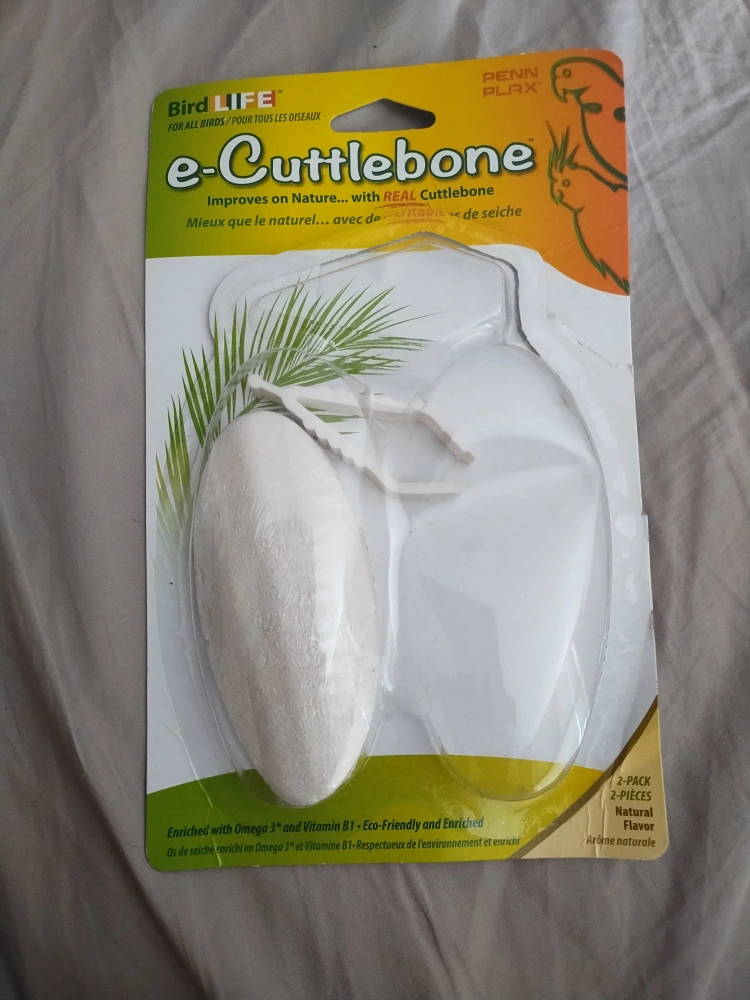 One e-Cuttlebone sealed in plastic (package is open). Enriched with Omega 3 and Vitamin B1. Eco-friendly and enriched natural flavour. For all birds. Intended for pets only. Keep out of reach of children—not a toy.