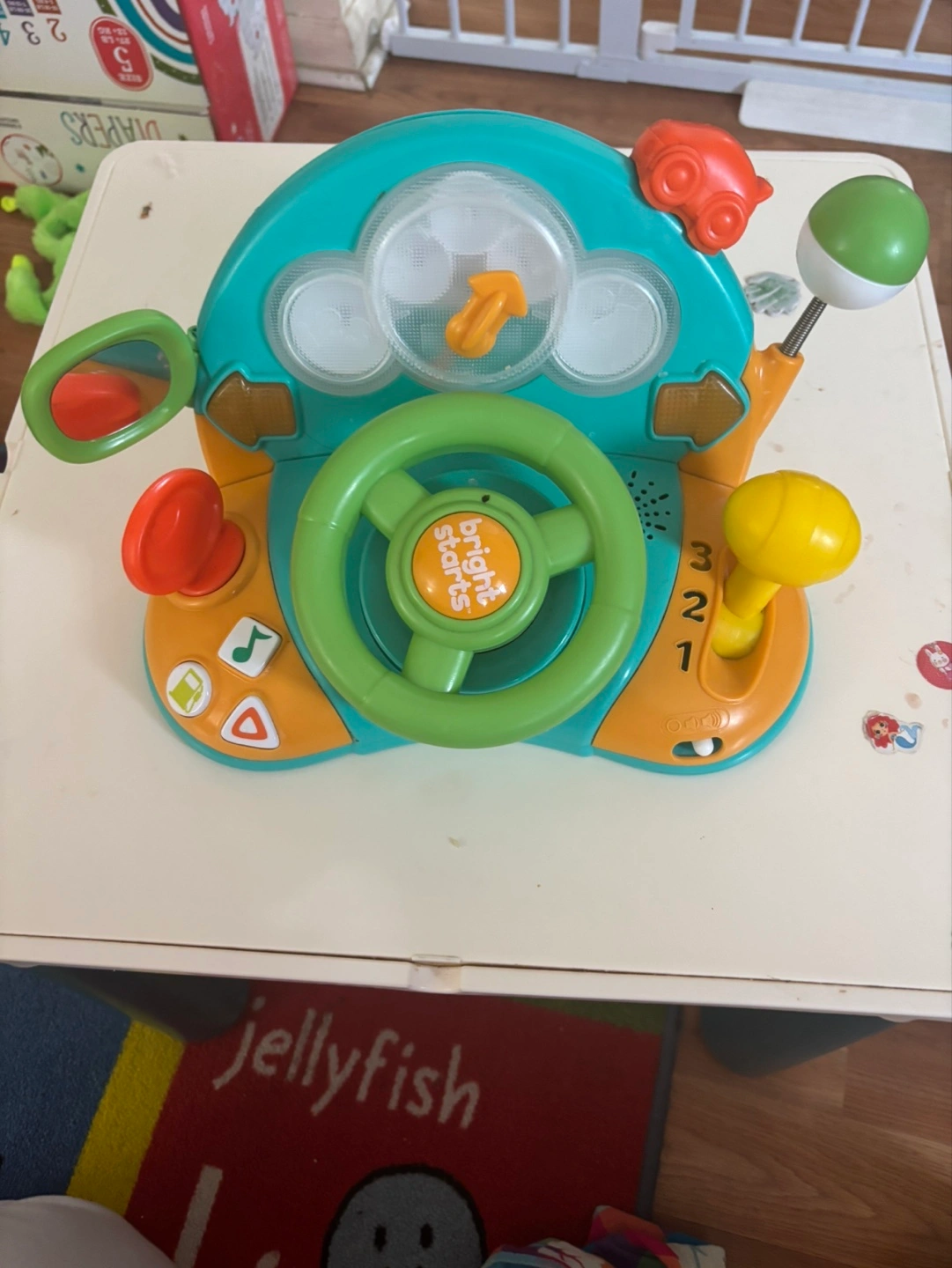 Baby toy steering wheel. Features lights, sounds, and multiple interactive buttons. Great for engaging little ones.