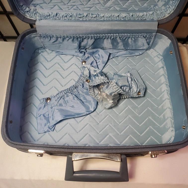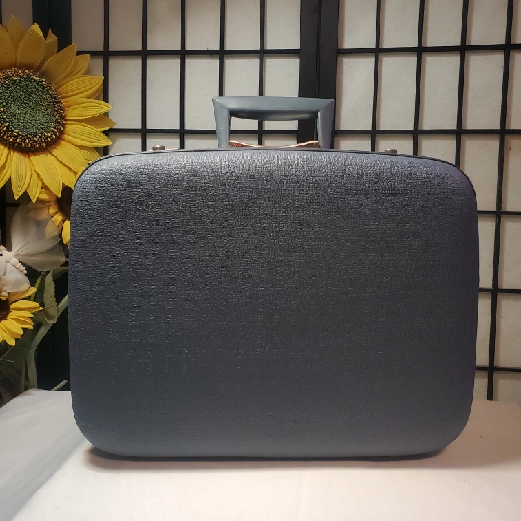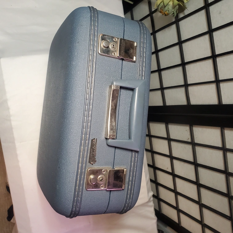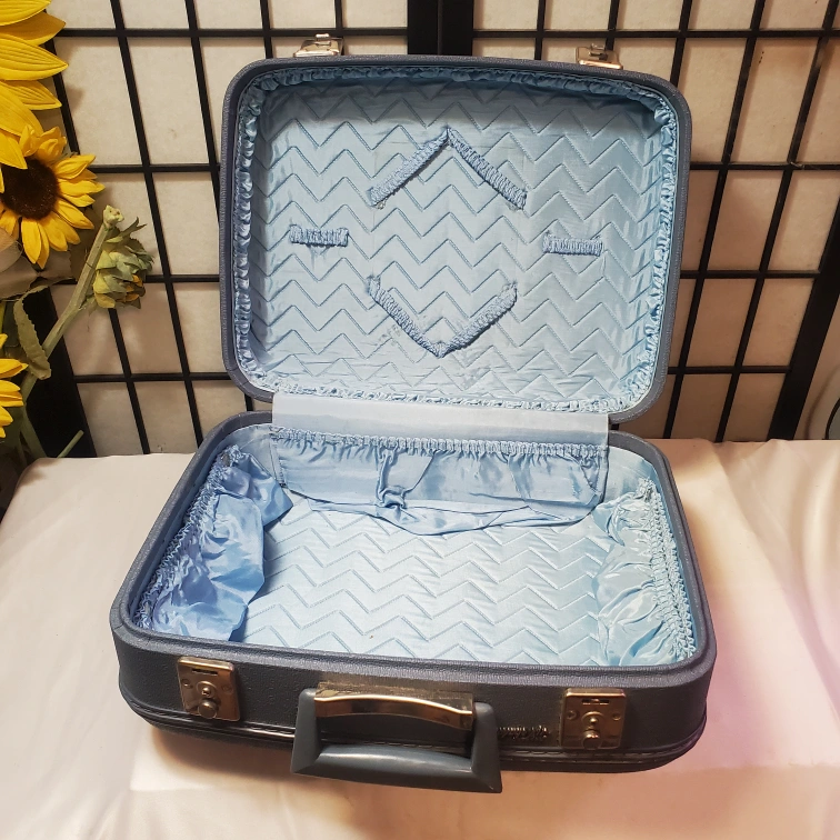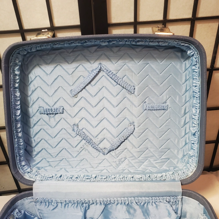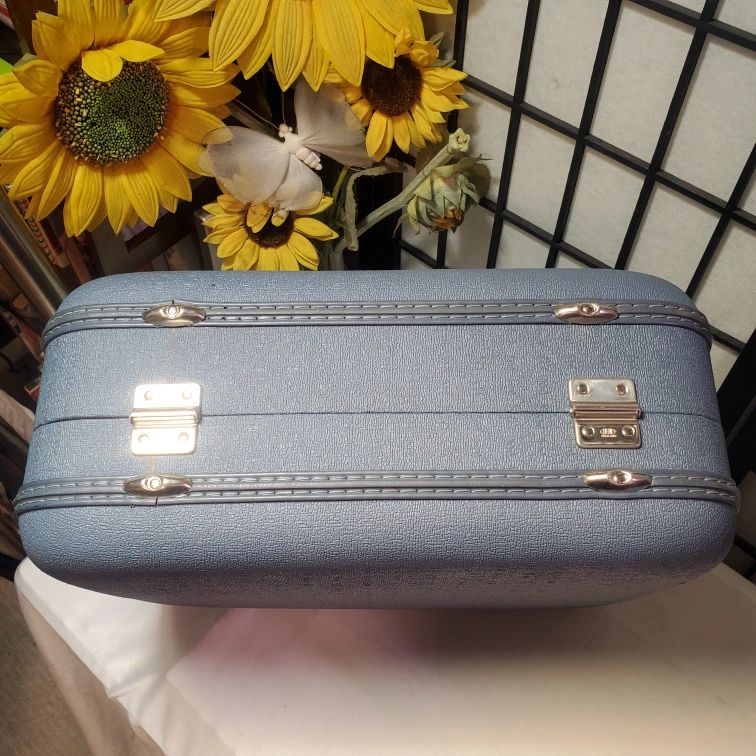Powder Blue hard shell. Features a top handle and two latches. Interior lined with light blue satin fabric. Pristine vintage condition.