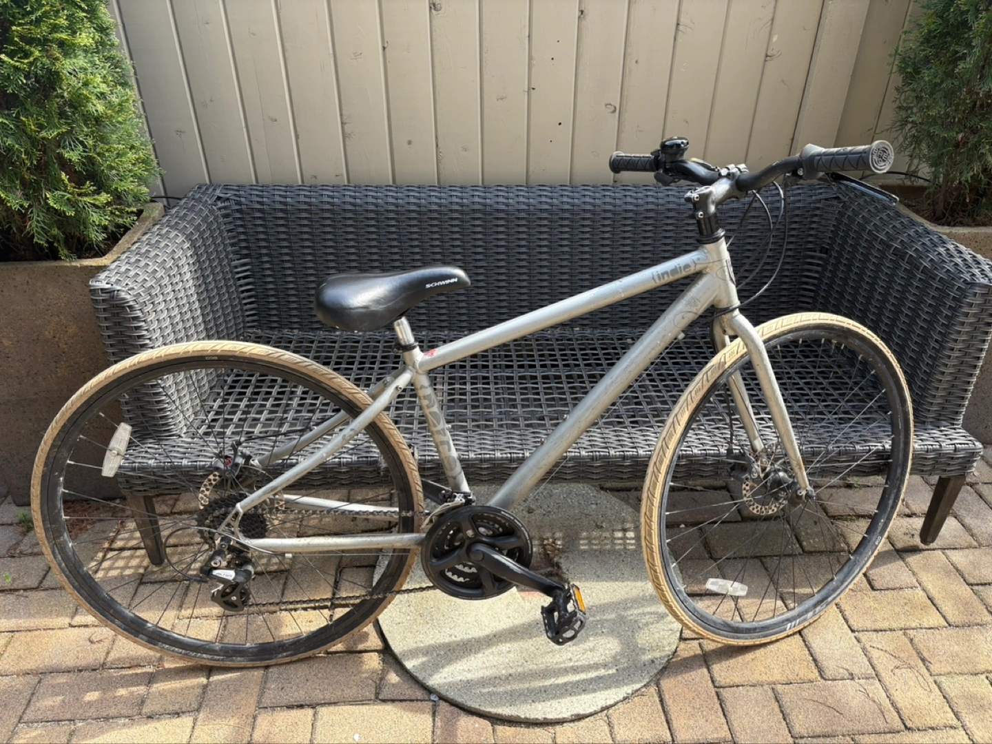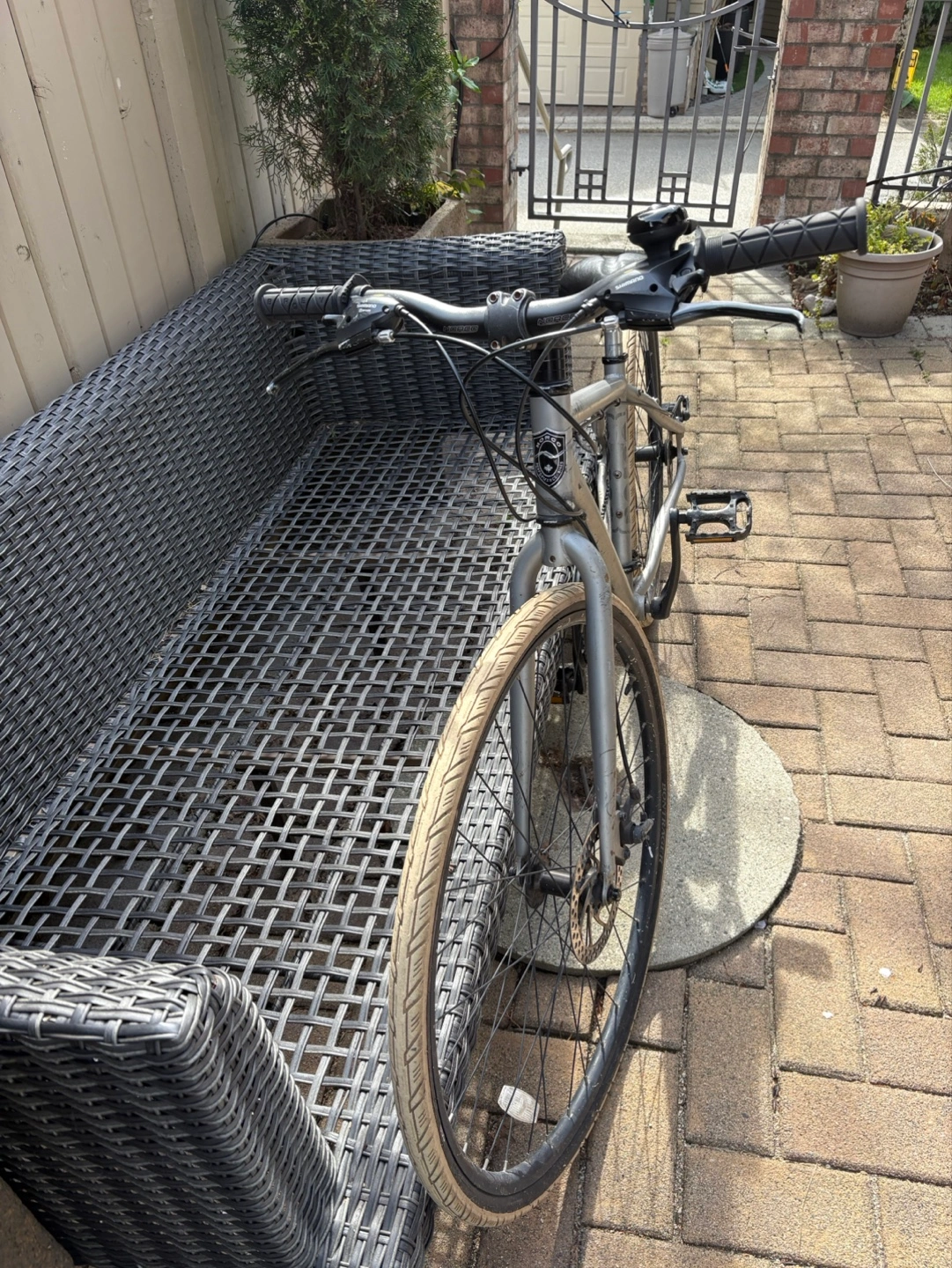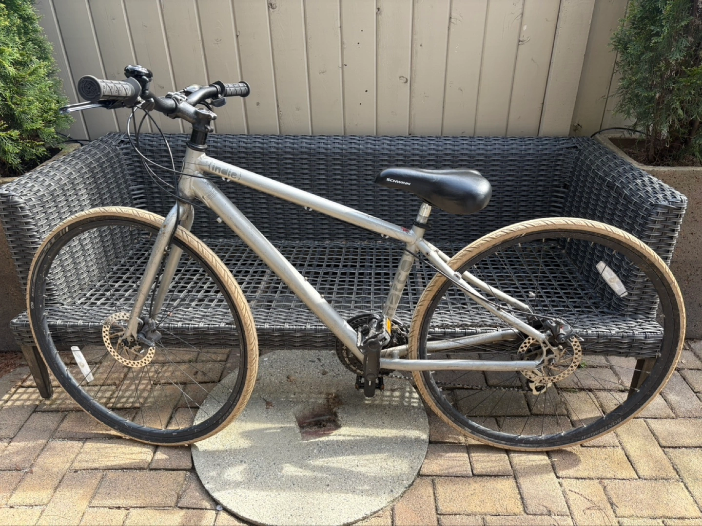 Silver Norco Indie hybrid bicycle. Used condition, shows some wear.