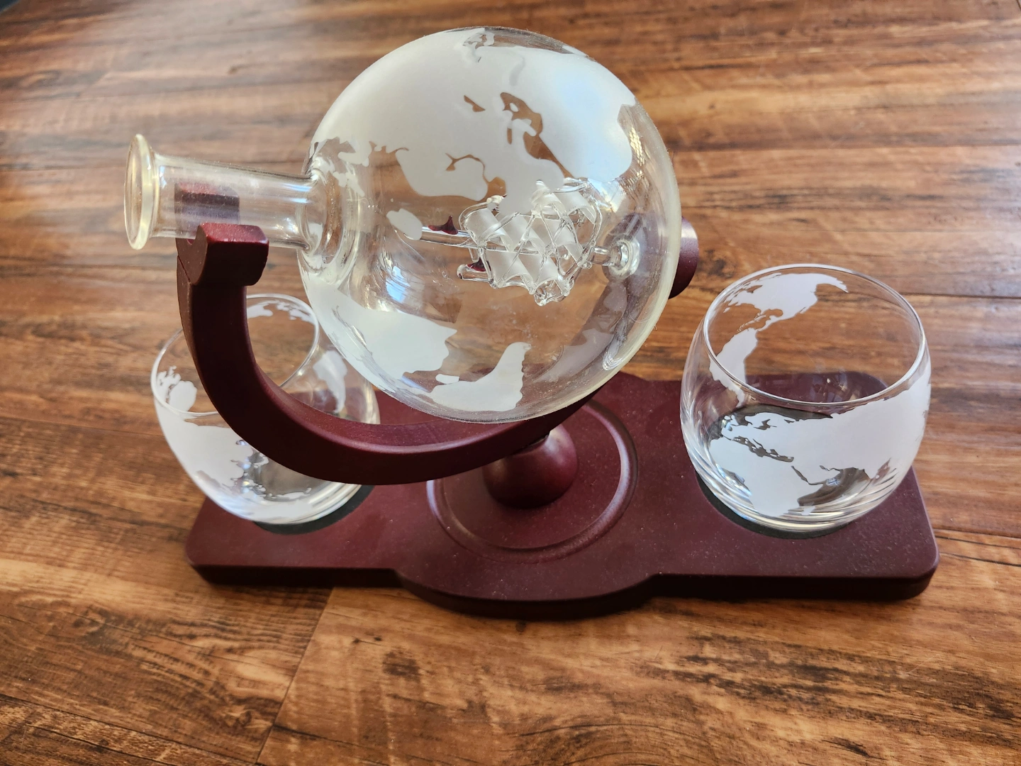Globe-shaped decanter set, little glass ship inside, two matching cocktail glasses, wooden base, and accessories.