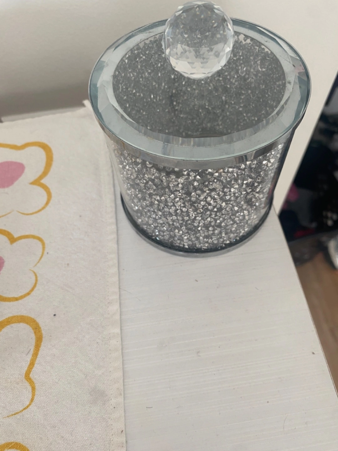 Small decorative jar. Glass container covered in sparkly crystals. Crystal ball knob on lid. Perfect for storing small items.