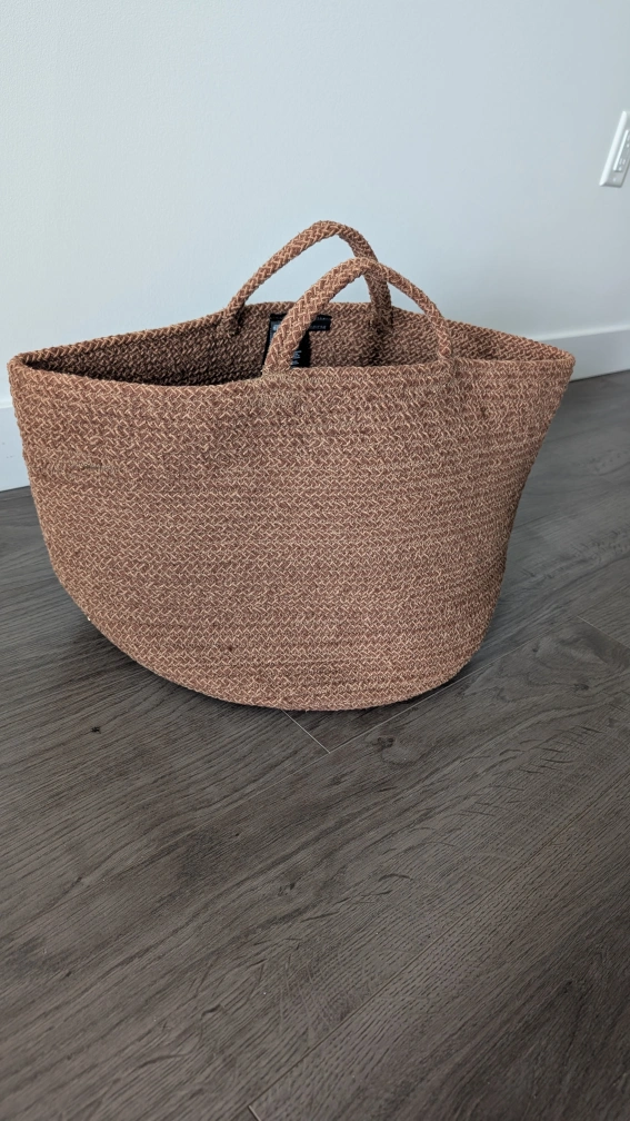 Large brown woven storage basket. Two handles. Perfect for blankets, toys, or other storage needs. Good condition. Barely used, beautiful brown colour with stitching.