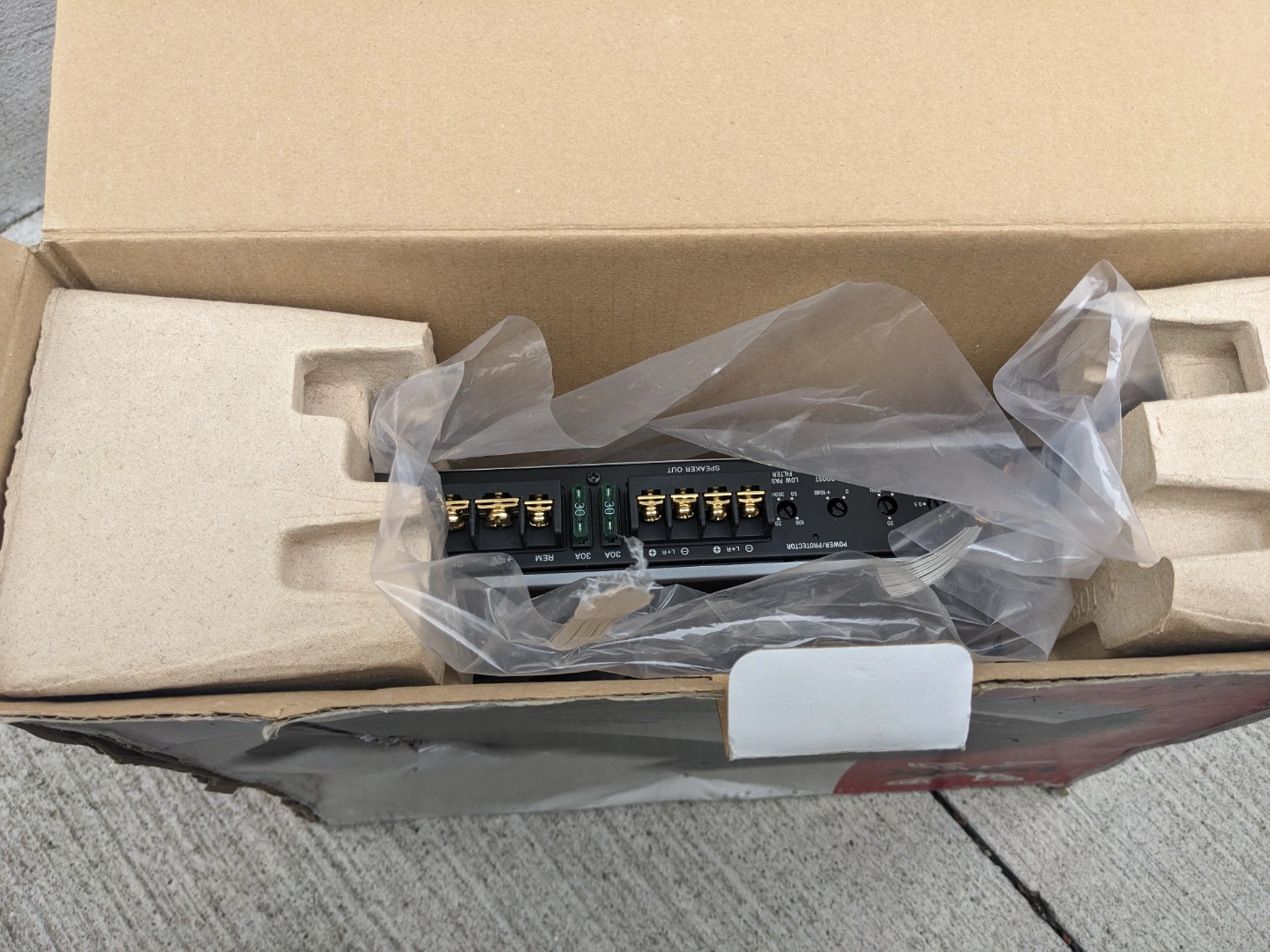 New in box, never used. Box damaged from being moved around in storage. Class D 2-channel amplifier. 1100W max power, 600w RMS rated power at 2ohms