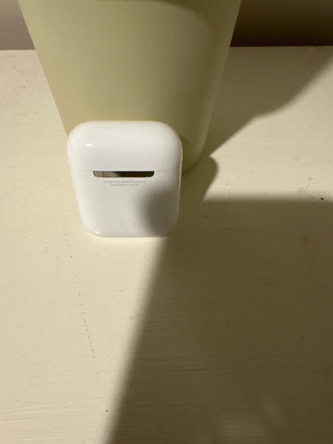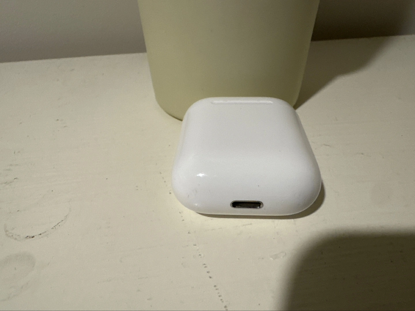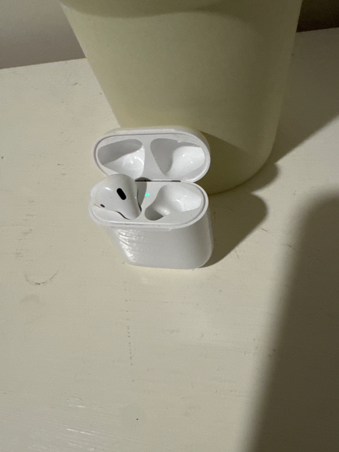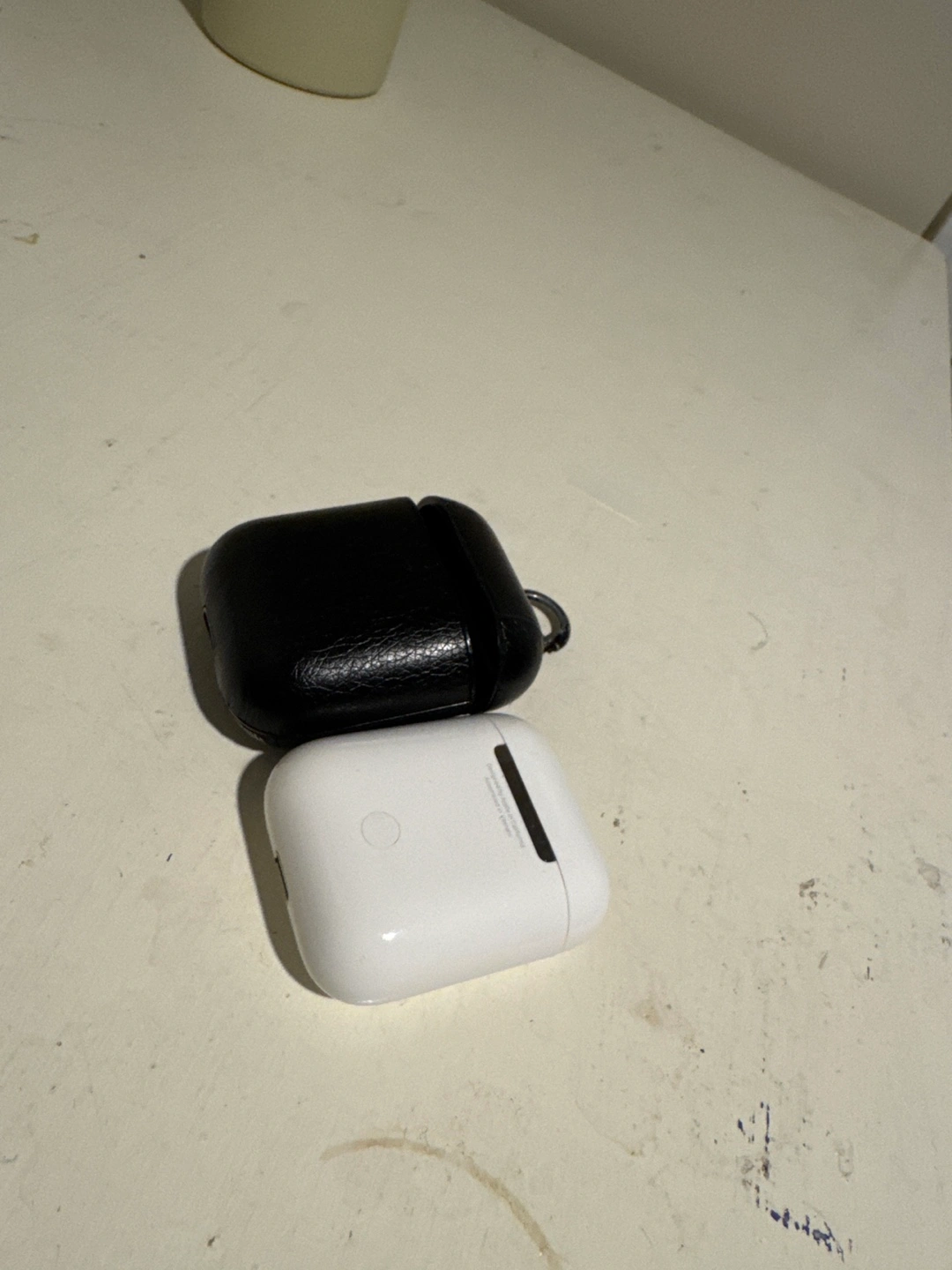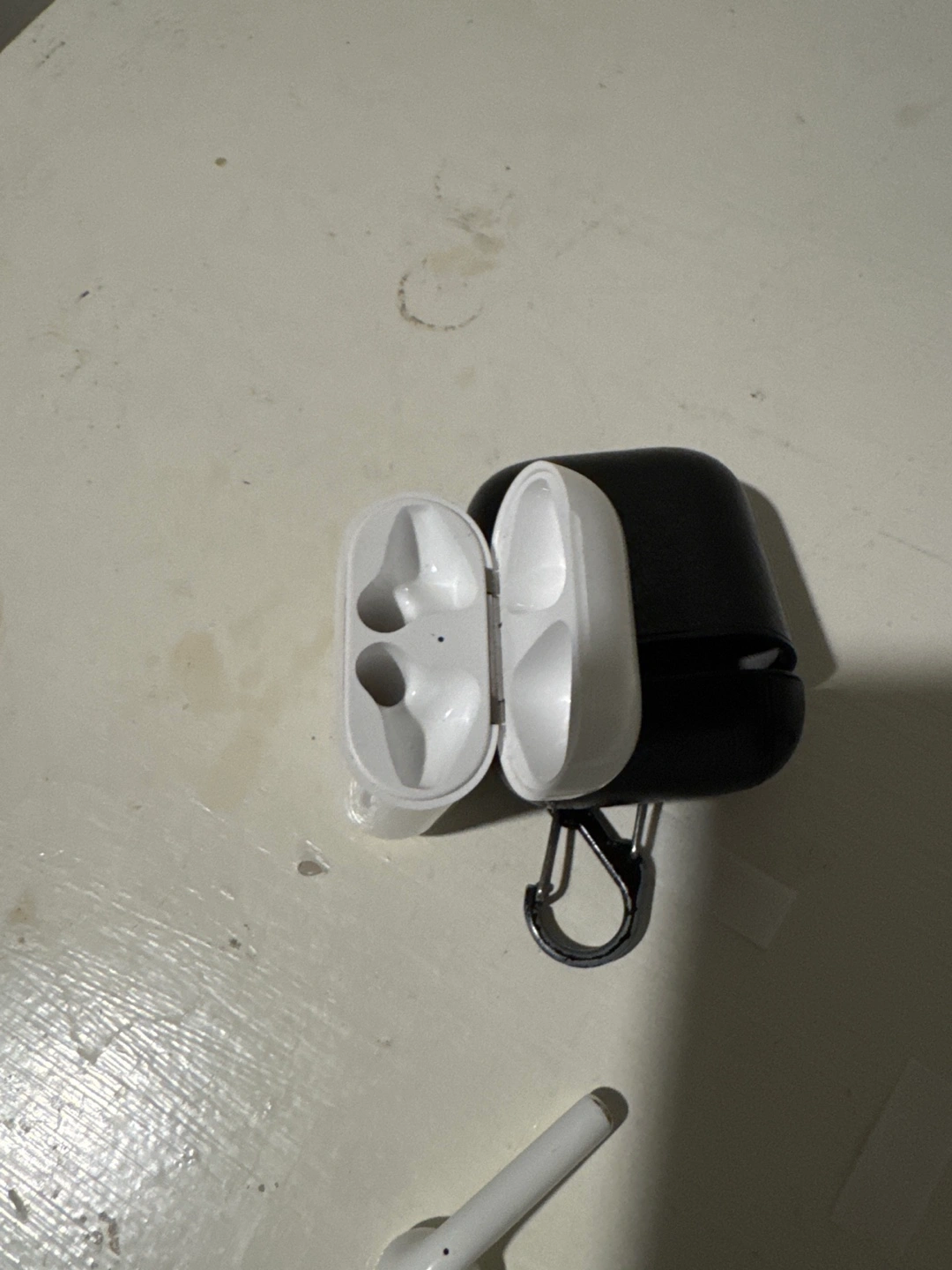 Wireless earbuds. Includes charging case and a black protective carrying case with a carabiner. One AirPod included.