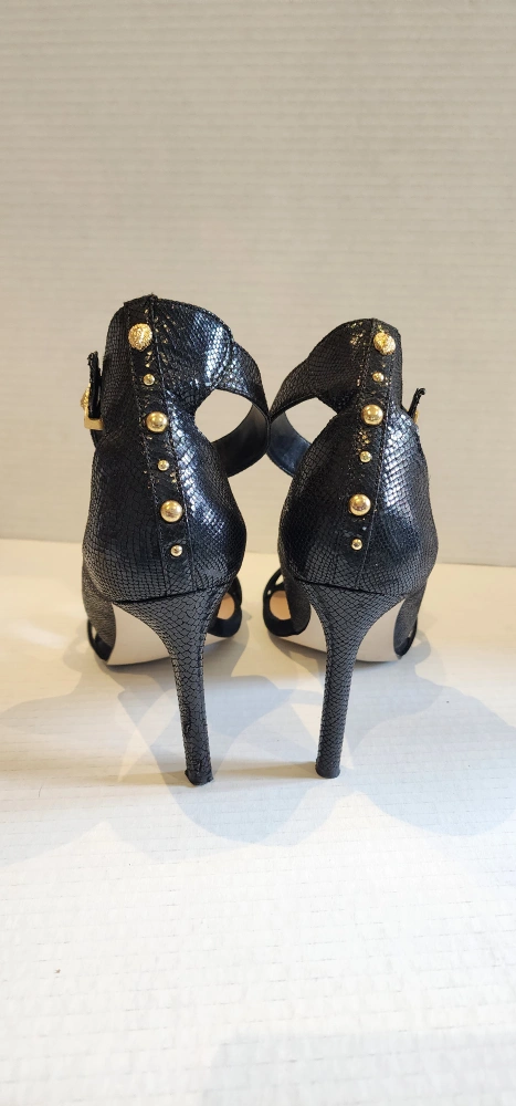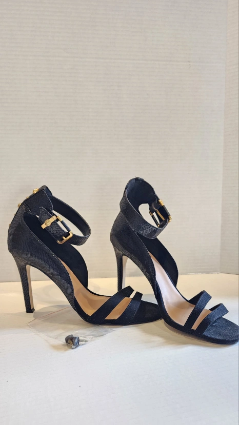 Black high-heeled sandals. Ankle strap with buckle closure. Suede-like material. Part of the Disney x Call It Spring collection. Heel height approximately 3 inches. Size 8.