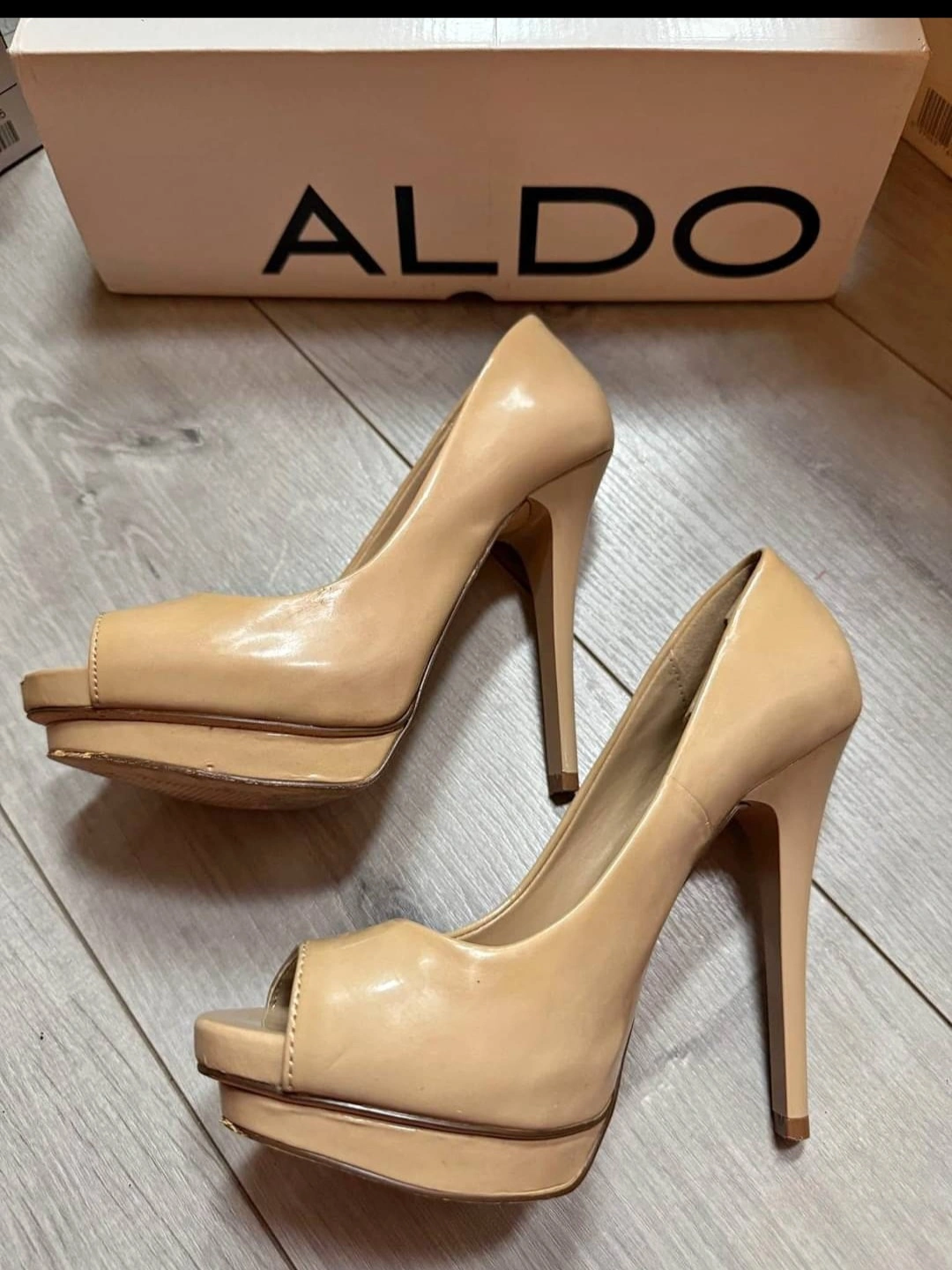 Nude coloured peep toe platform heels. High stiletto heels. Some wear and tear visible. Size 35.