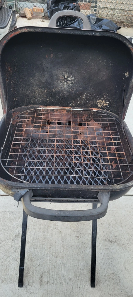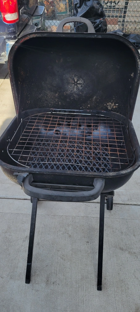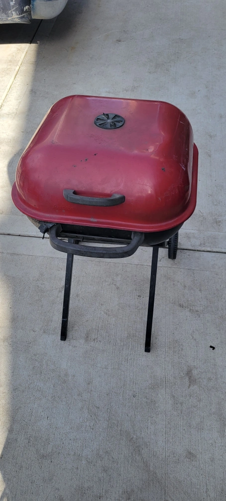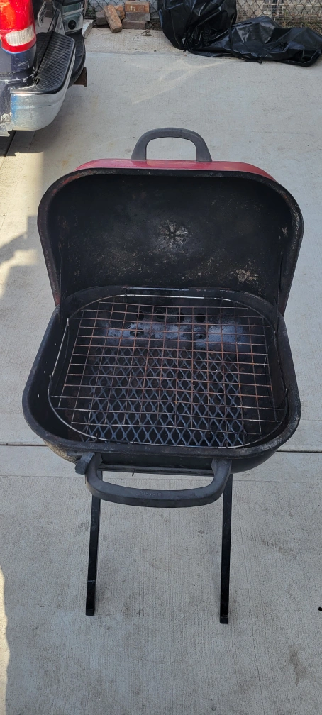 Small portable charcoal grill. Black metal body, red lid. Used condition, shows wear. Includes grilling grate. Perfect for small spaces or camping.