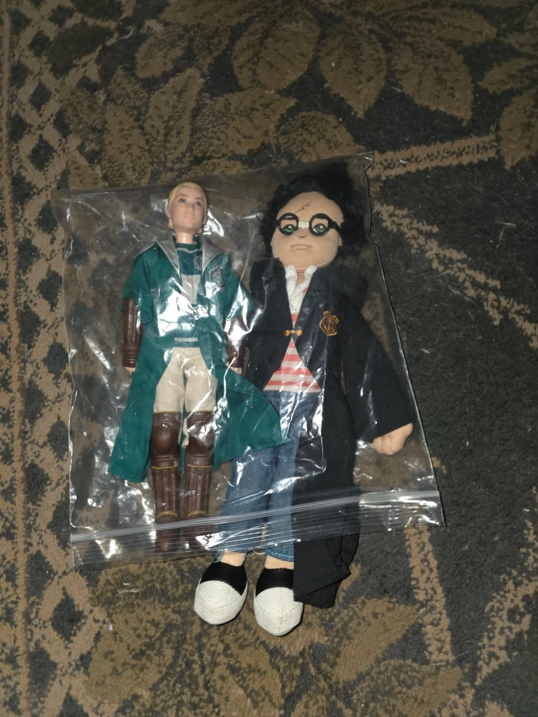 This set features two plush dolls, one resembling Harry Potter and the other Draco Malfoy. Both are wearing their Hogwarts school uniforms. They're all bundled up and ready for a magical adventure! These dolls are made of soft plush material.
