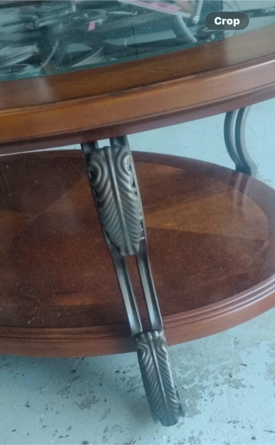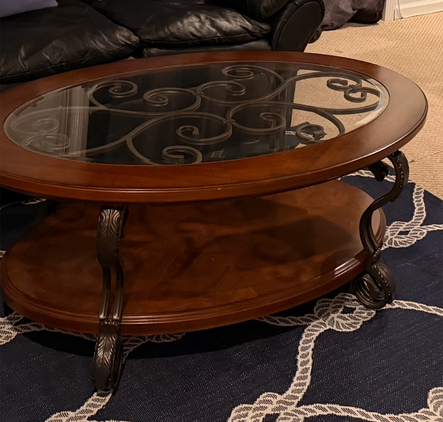 Oval coffee table featuring a glass top with decorative metal scrollwork. It has a warm wood finish on the base and legs. The lower shelf offers extra storage or display space.