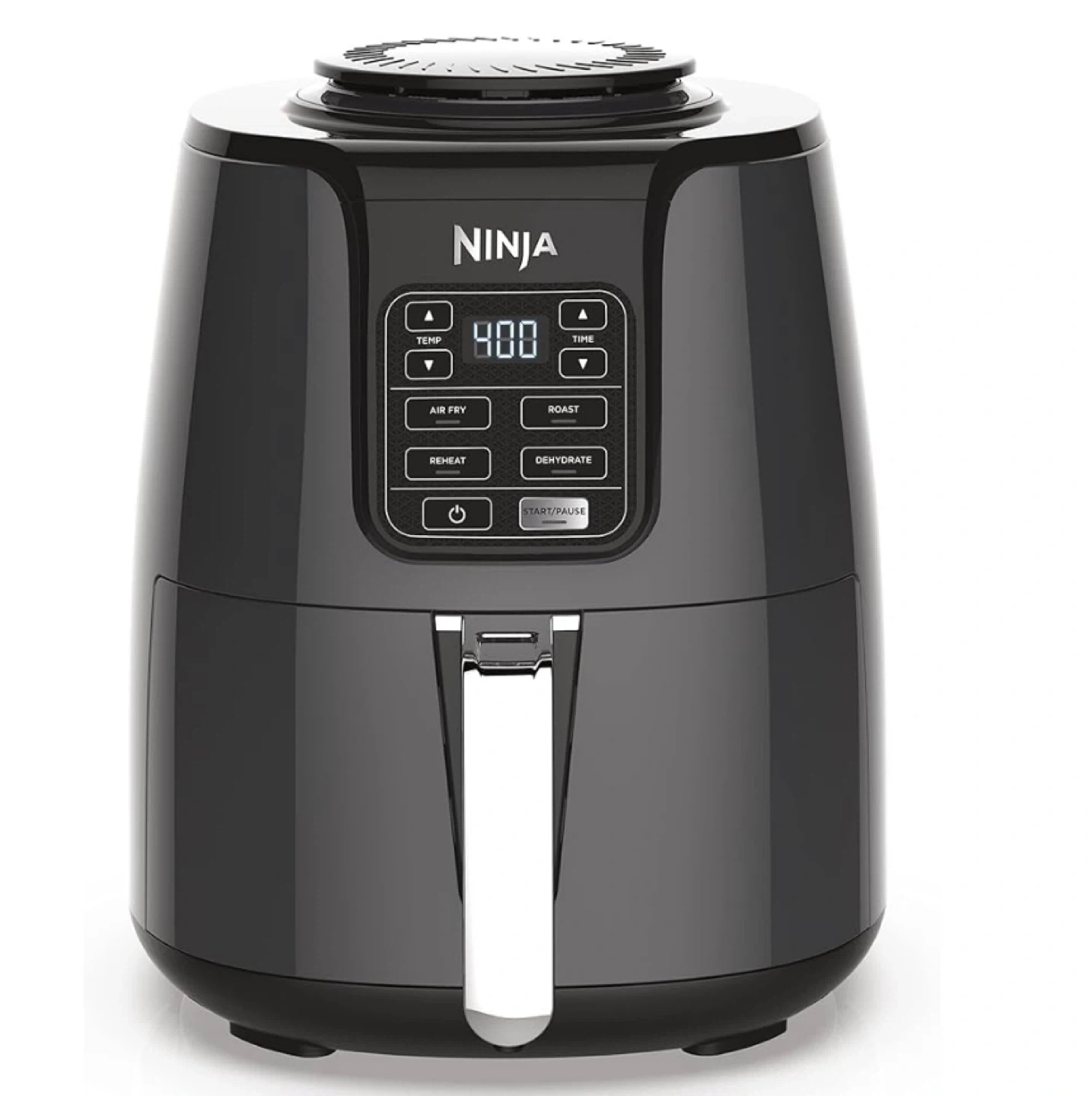 Received this as an unwanted Christmas gift. Opened but unused. This is a black Ninja air fryer with digital controls. It has settings for Air Fry, Roast, Reheat, and Dehydrate. The display shows temperature and time settings.