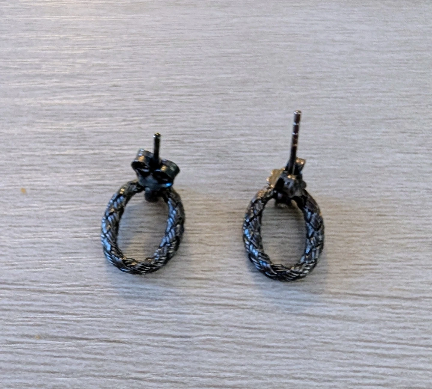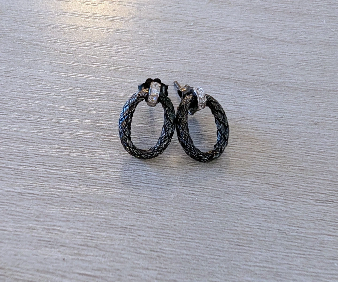These small hoop earrings feature a braided design with a sparkly crystal accent. They have a post back closure and are suitable for everyday wear. A nice touch for any outfit!