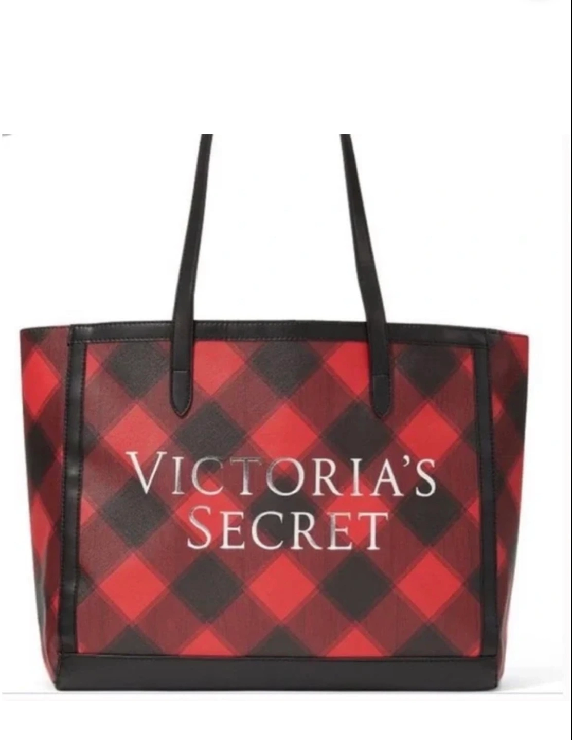 Large tote bag. Red and black plaid pattern. Two shoulder straps. Victoria's Secret branding.