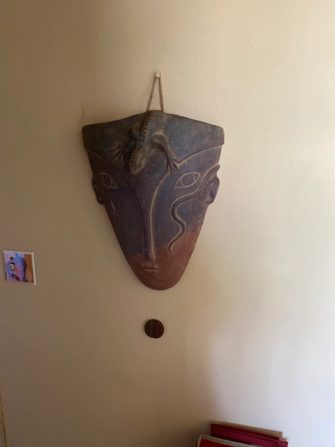 Large Unique clay mask. Features a lizard on top. Brown and terracotta tones. Wall hanging.
