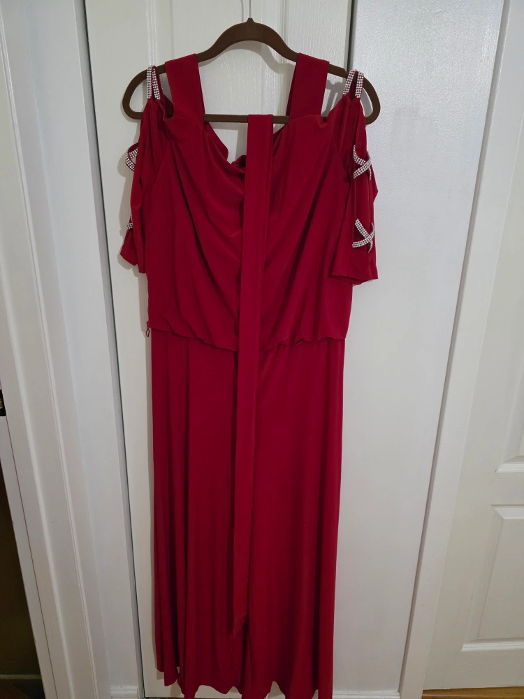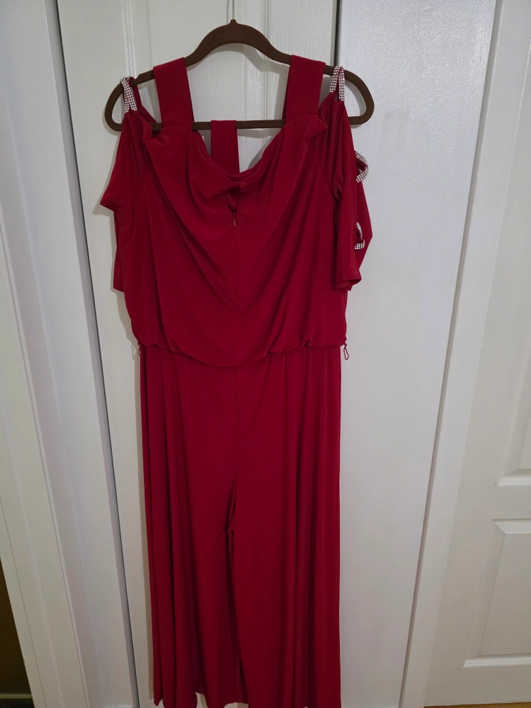 Stunning red jumpsuit, perfect for a special occasion. Features off-the-shoulder sleeves and rhinestone accents. Wide legs and flattering fit. Back zipper closure.