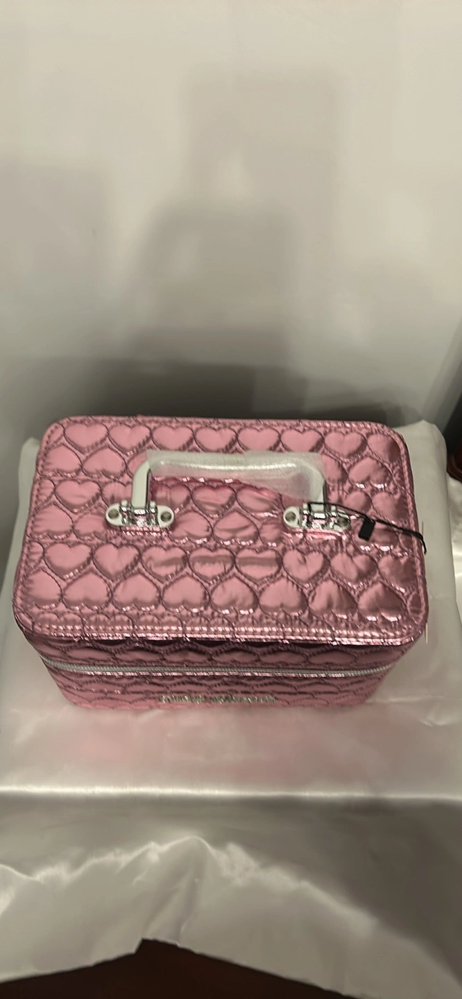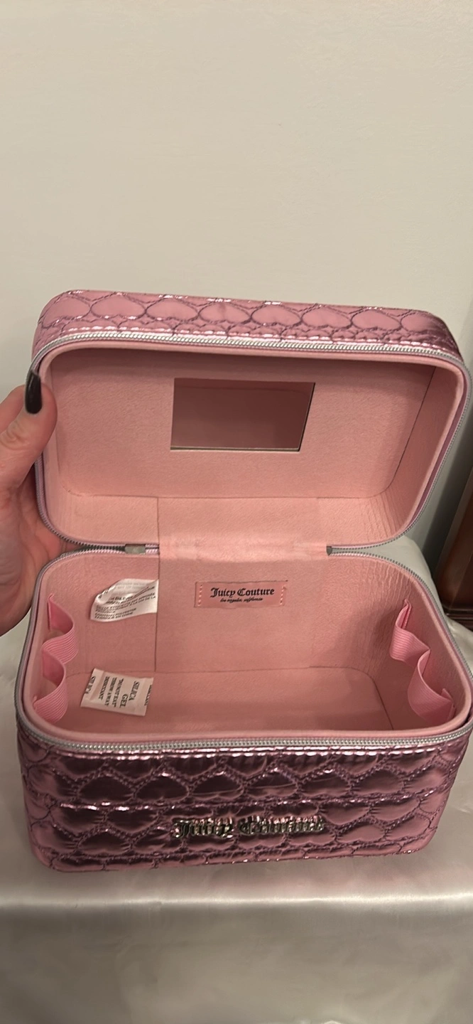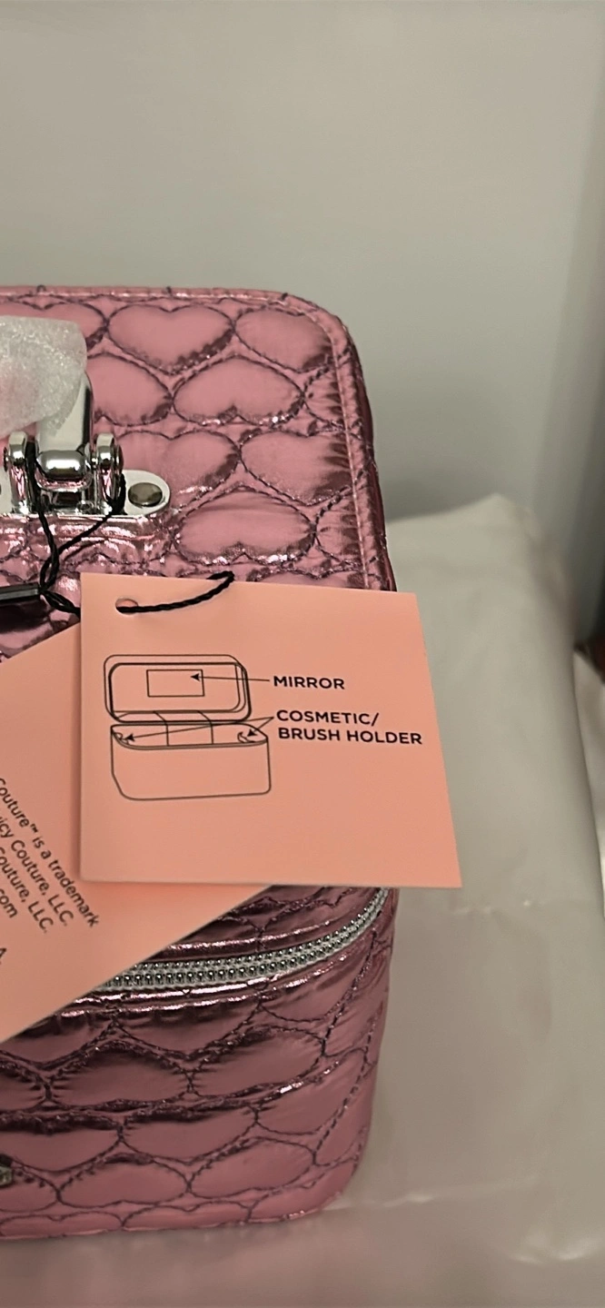 Pink cosmetic case. Quilted design. Features a mirror and brush holder. Silver-toned hardware. Zipper closure. Carry handle.
