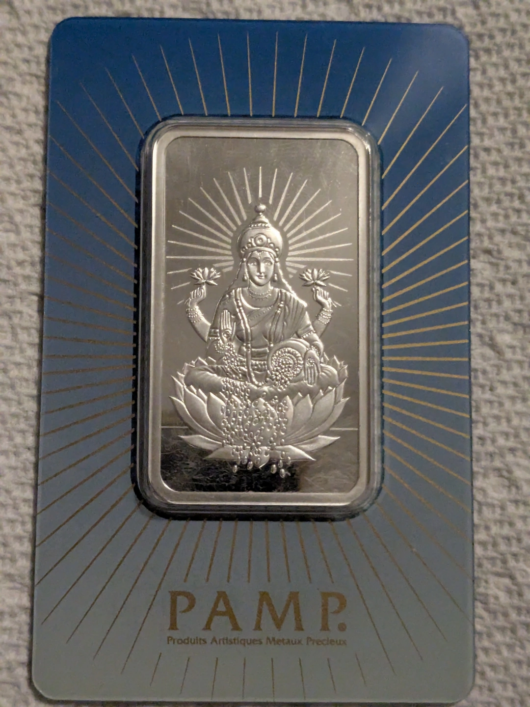 PAMP SUISSE LAKSHMI WEALTH HINDU GODDESS 1 ounce.999 fine silver Art Bar with certificate number C007253 Swiss made.