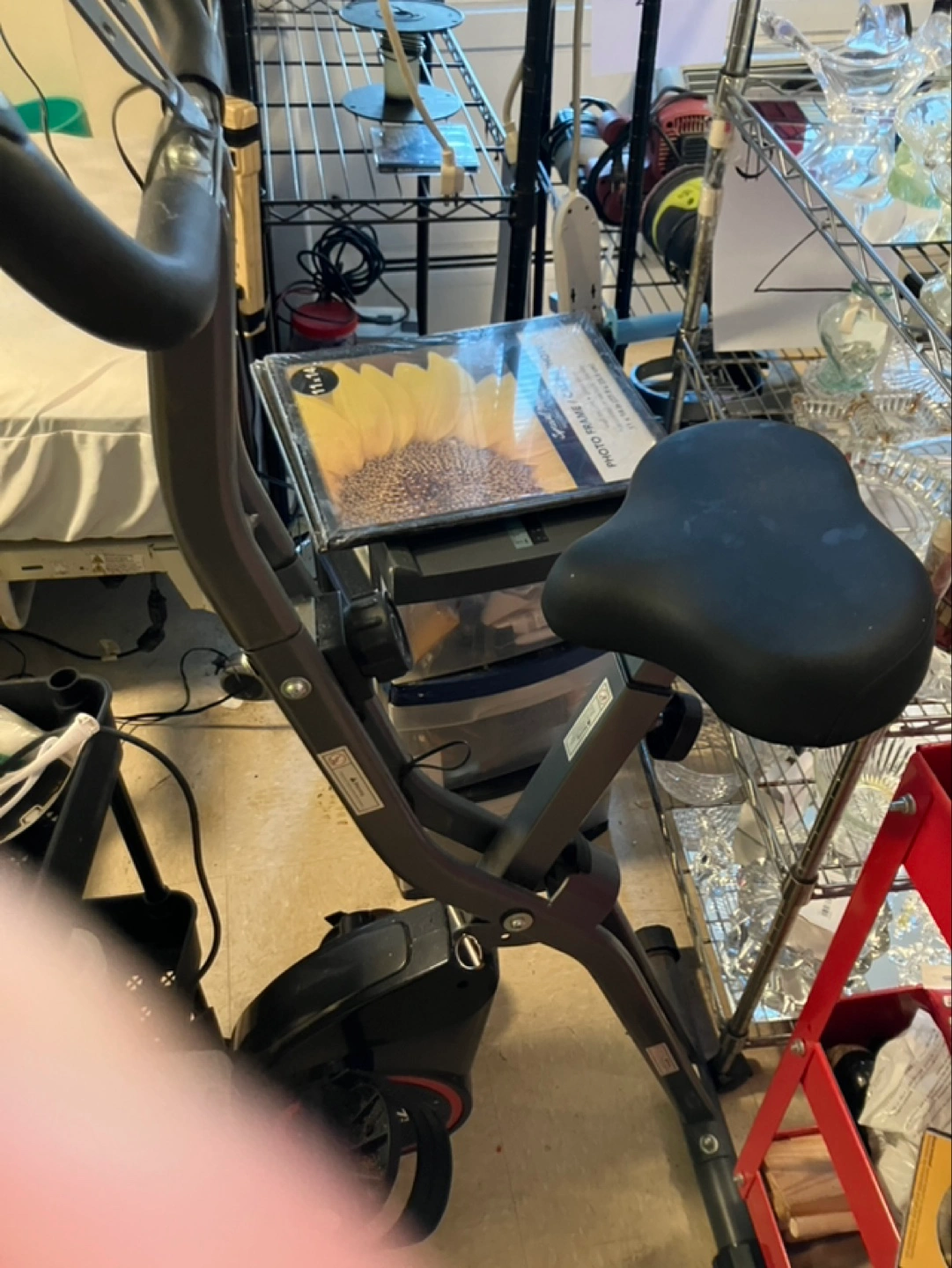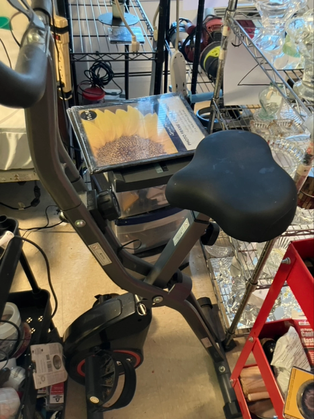 Compact folding stationary bike. Great for small spaces. Black frame. Adjustable seat. Used condition. Used once for exercise! Makes a great coat rack too