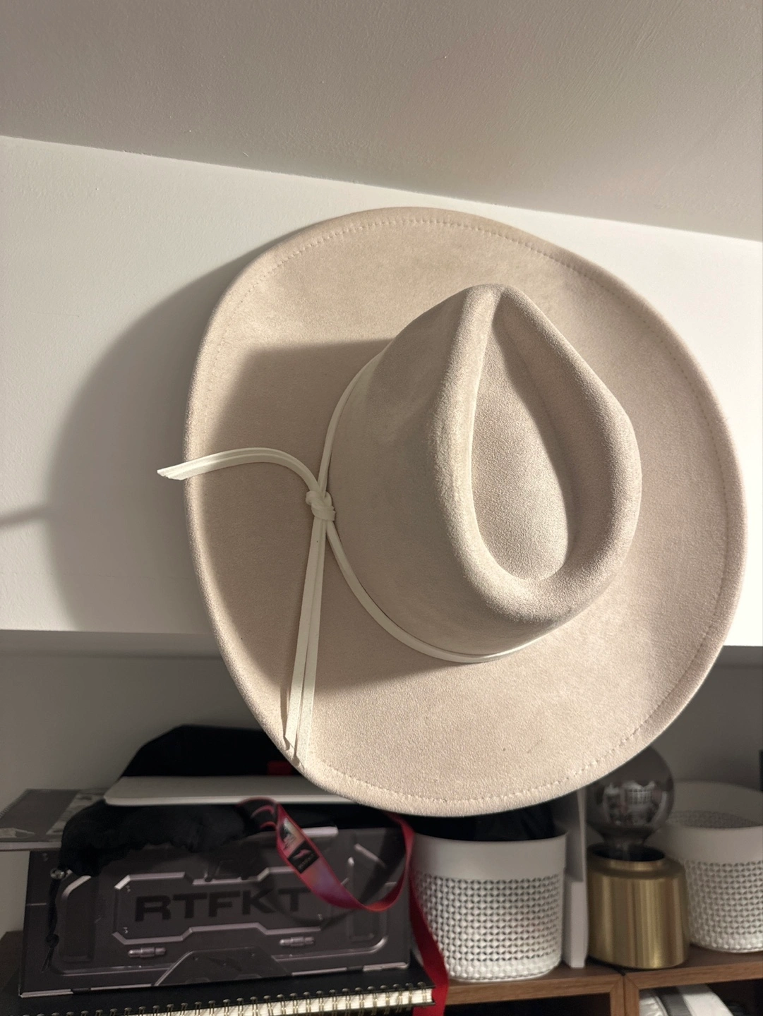 246Cream coloured suede fedora. Features a wide brim and a thin off-white ribbon detail. Perfect for adding a touch of elegance to any outfit.