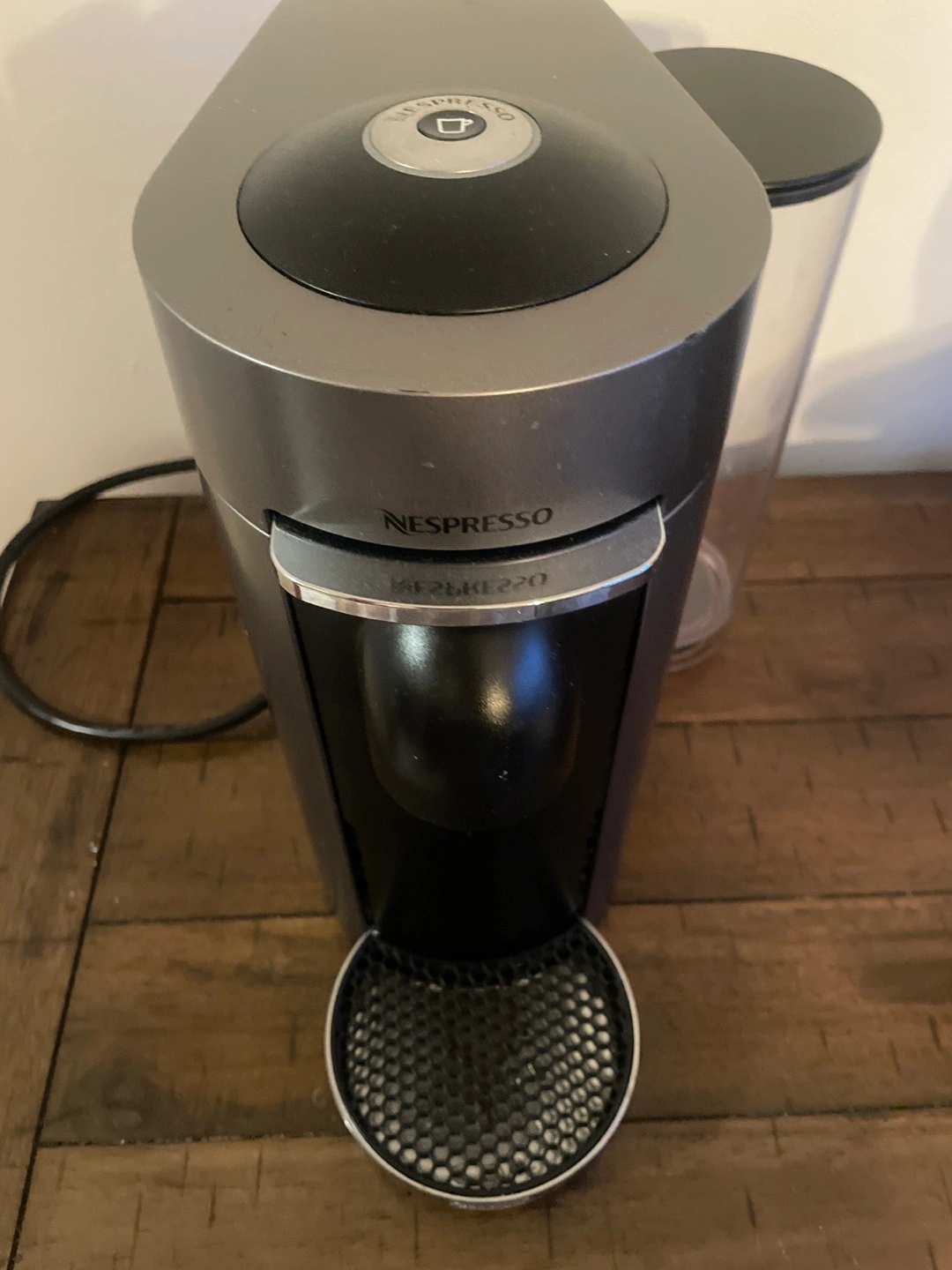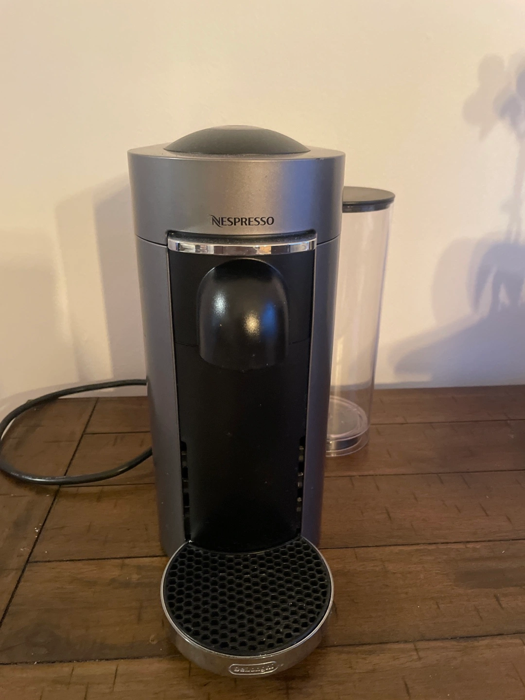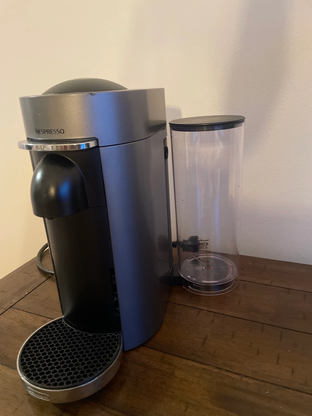 Used Nespresso by DeLonghi coffee machine. Gray and black. Good condition.