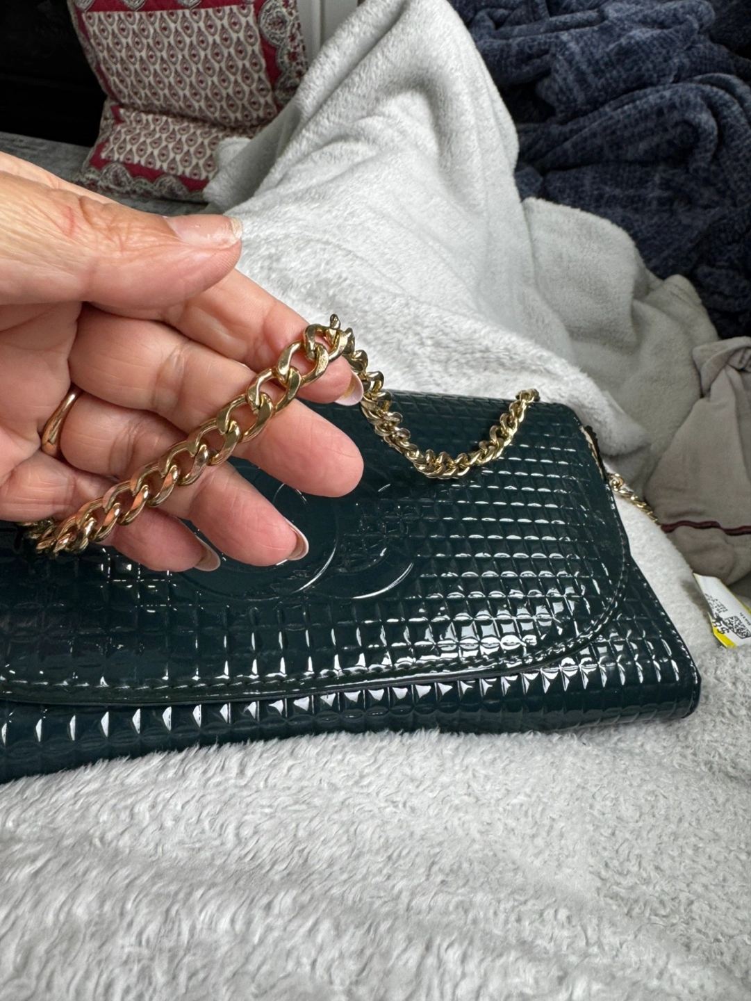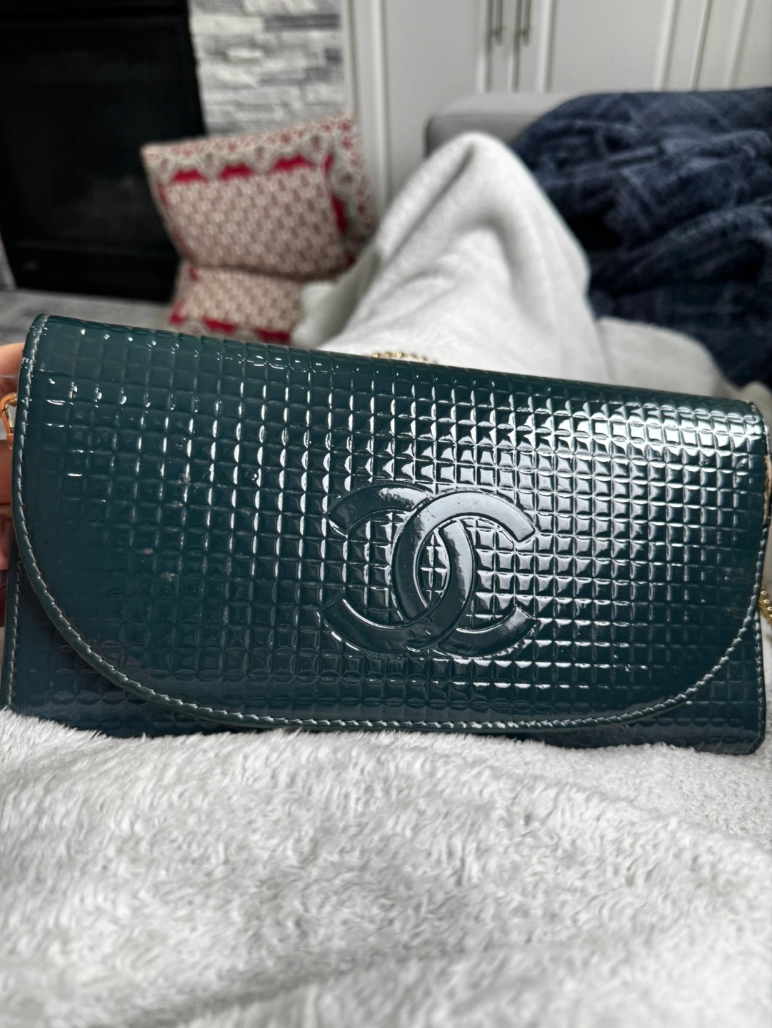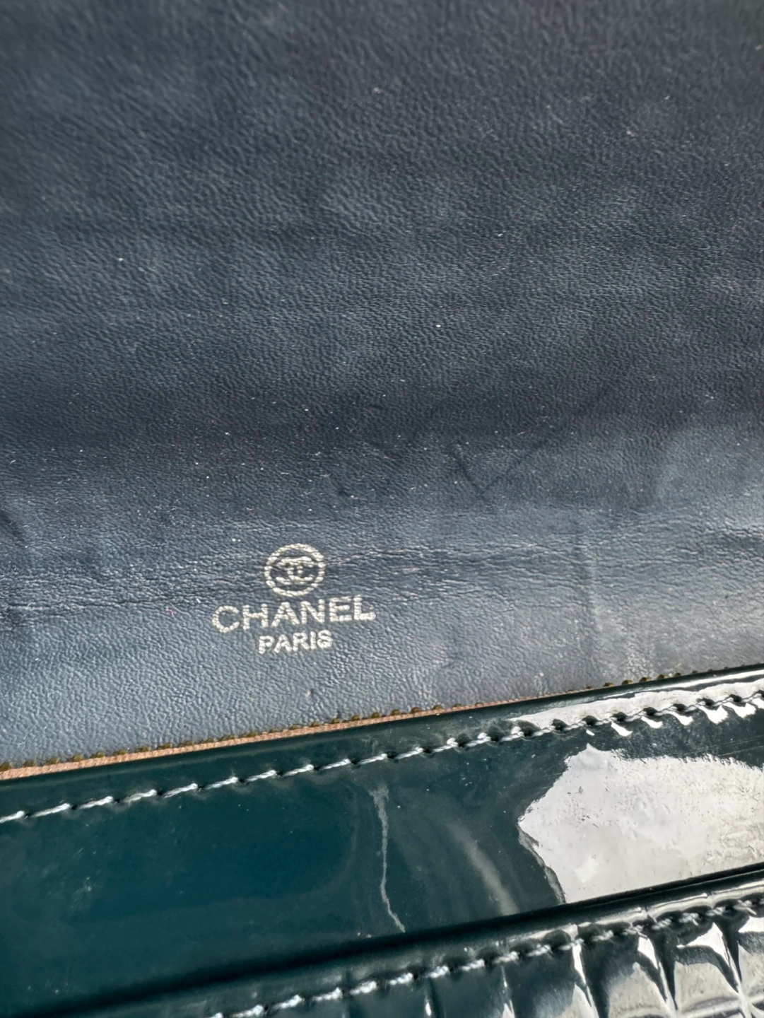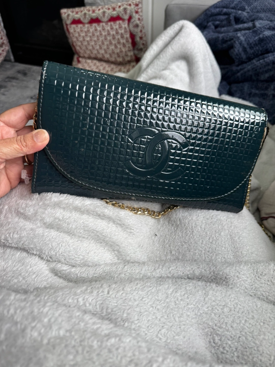 Dark green quilted patent leather. Gold-tone hardware. Chain strap. Interior zippered compartment and card slots. Pre-owned.