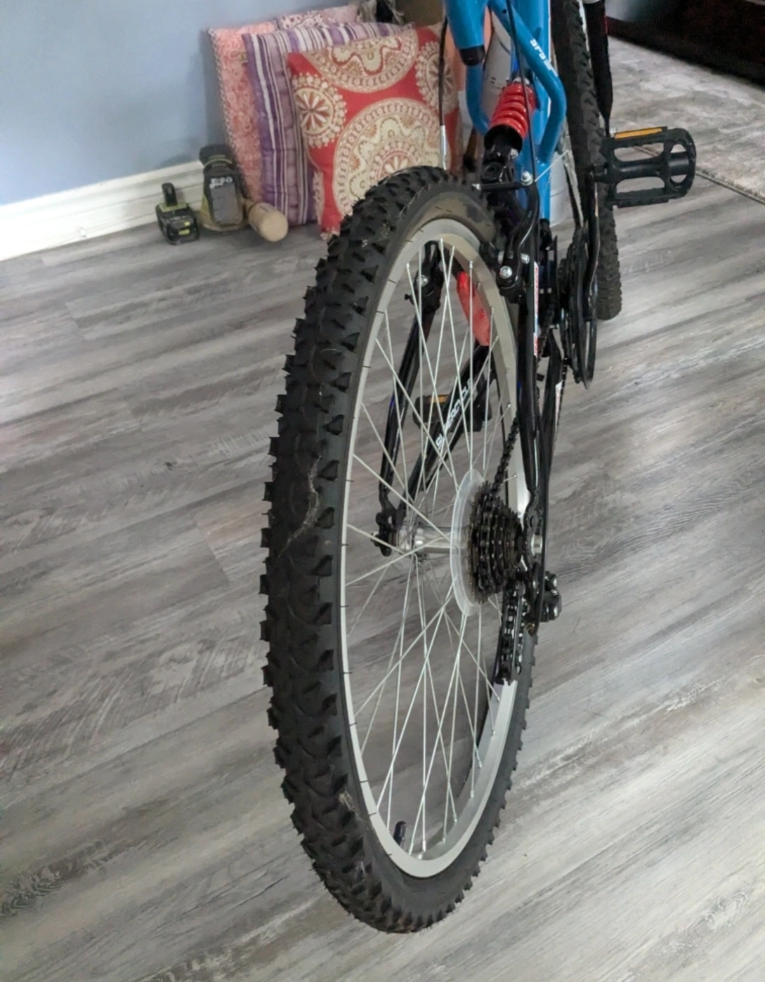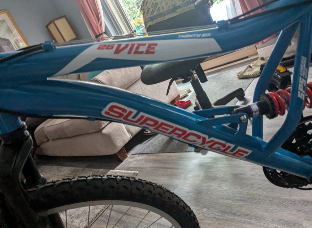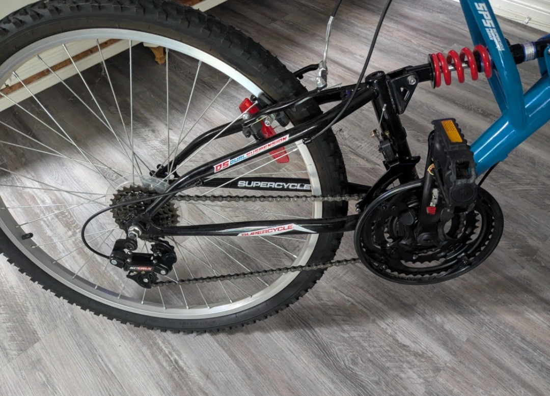 The Supercycle Vice 26" Dual Suspension Mountain Bike features a full suspension steel frame with shock fork and rear suspension spring for a smoother, more efficient ride. What makes it extra cool? This bike has an 18-speed derailleur, pearlized black paint, alloy rims, and derailleur guard.