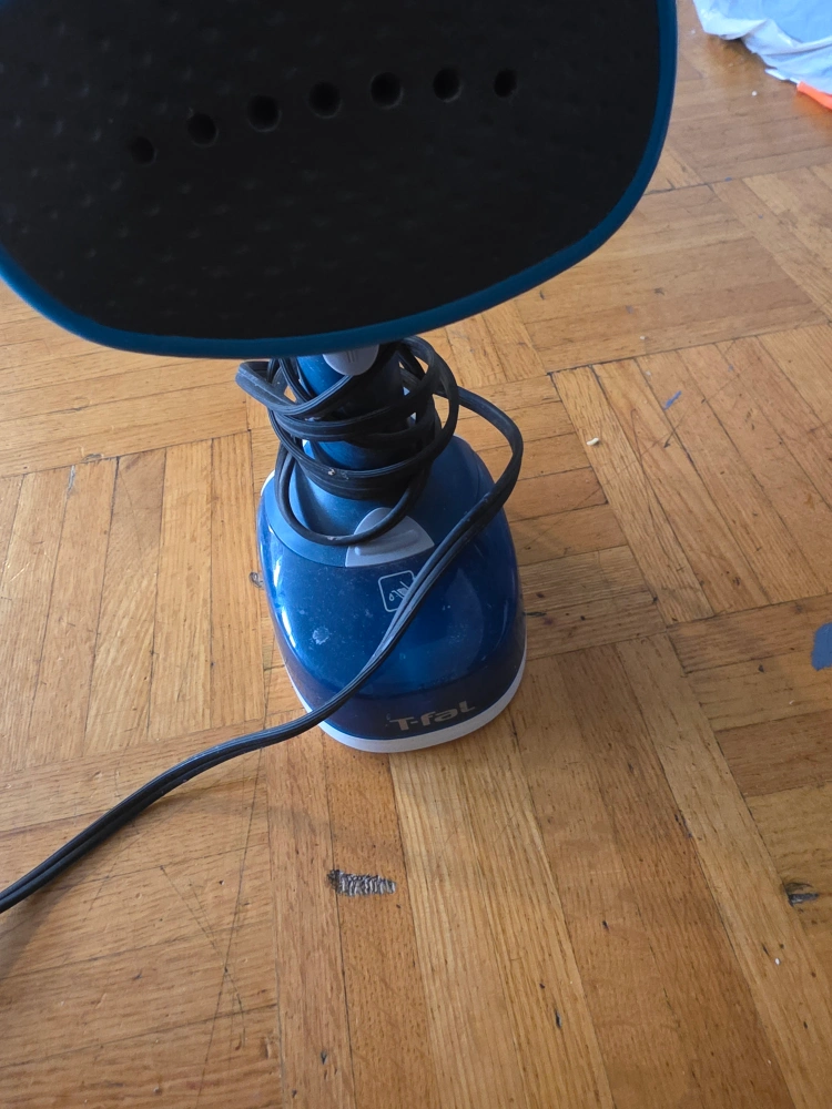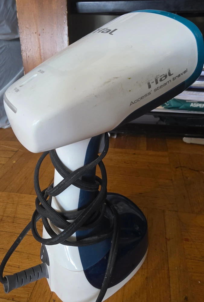Portable garment steamer. Compact design. Good for travel. Voltage selector switch.