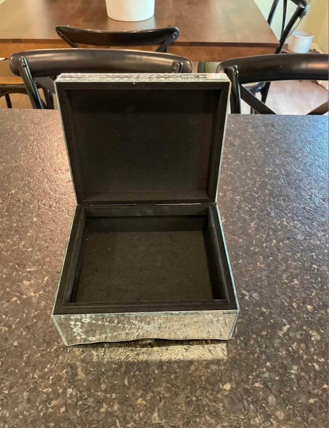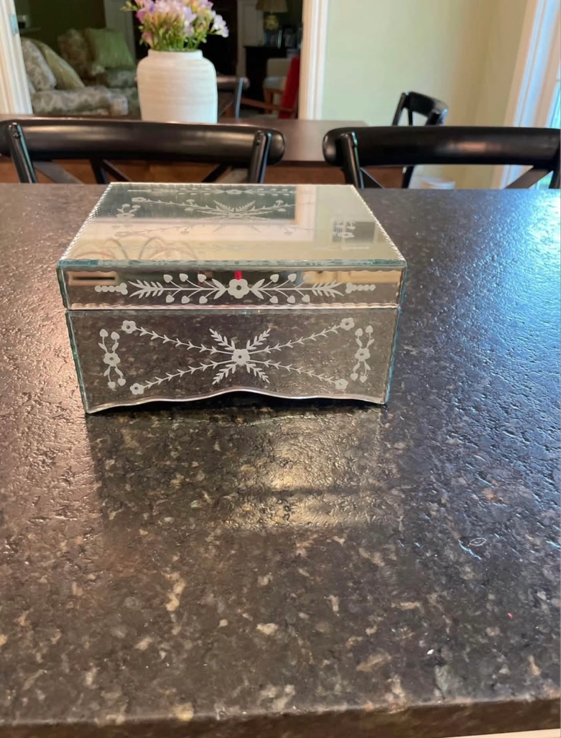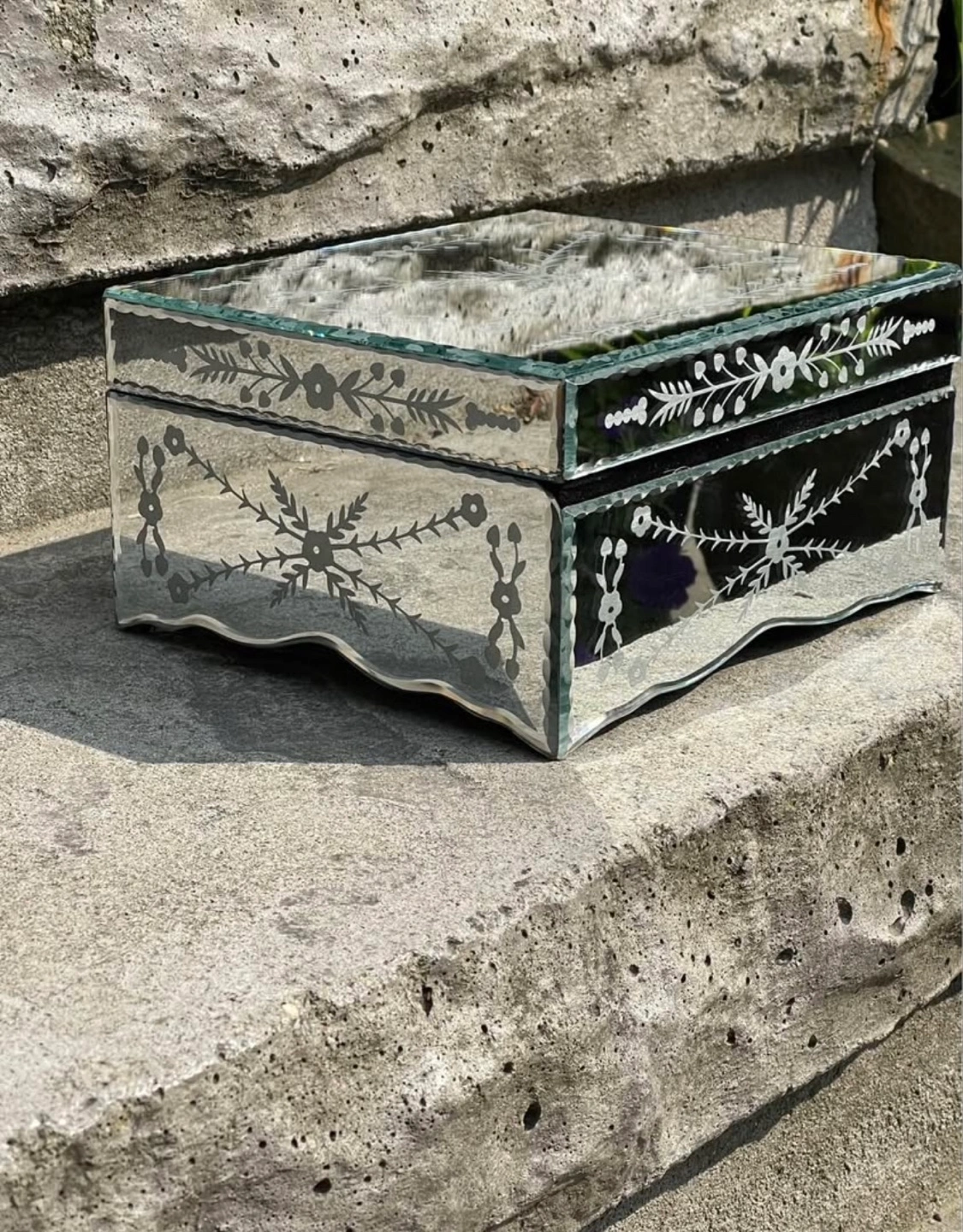 Beautiful mirrored jewelry box. Features an etched floral design. Black velvet interior. Perfect for storing small treasures.