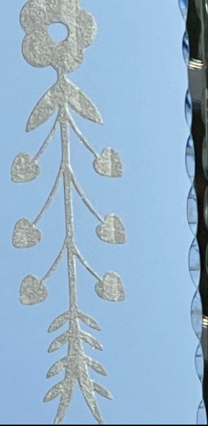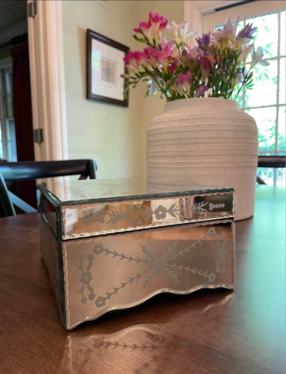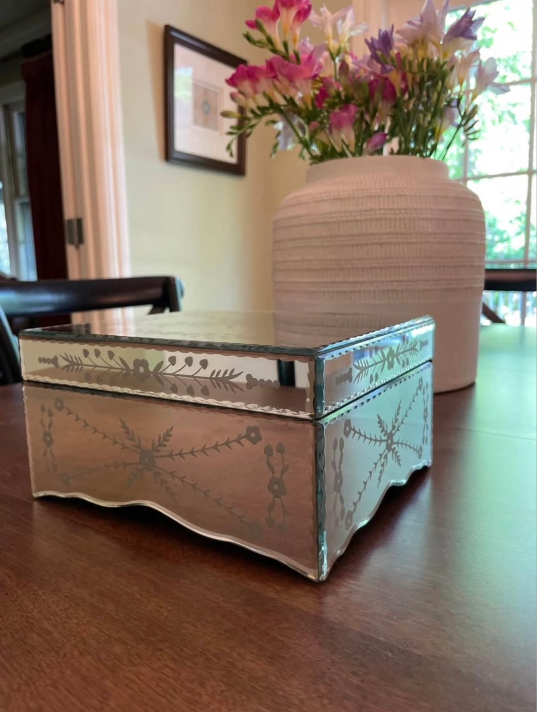 Beautiful mirrored jewelry box. Features an etched floral design. Black velvet interior. Perfect for storing small treasures.