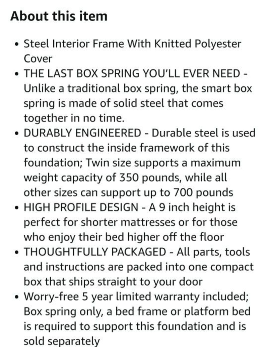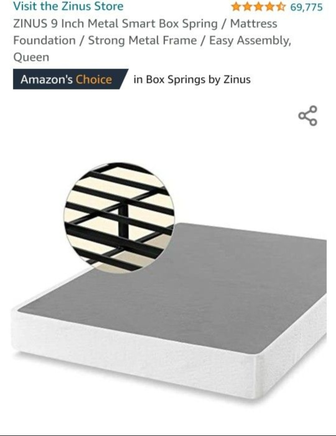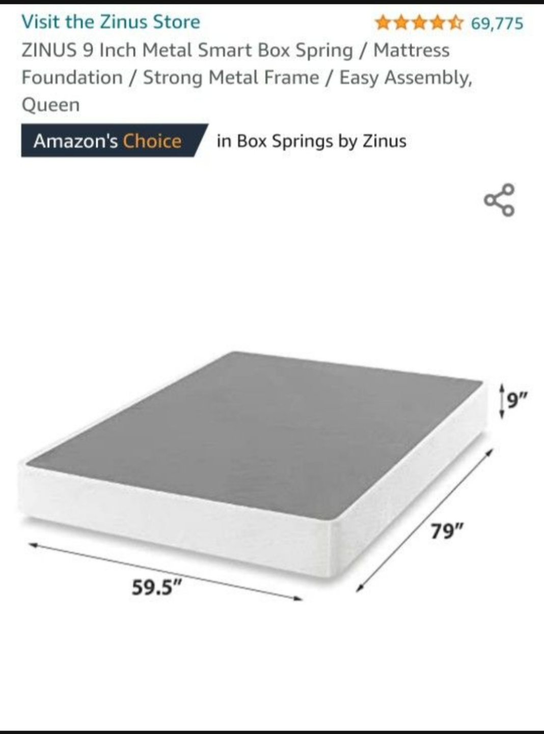 9" boxspring, it's metal and goes together with an easy nut & bolt system, then with a zippered cloth surrounding the metal frame. Currently disassembled for easy transportation. Dimensions shown in screenshot from Amazon where I originally bought it from.
