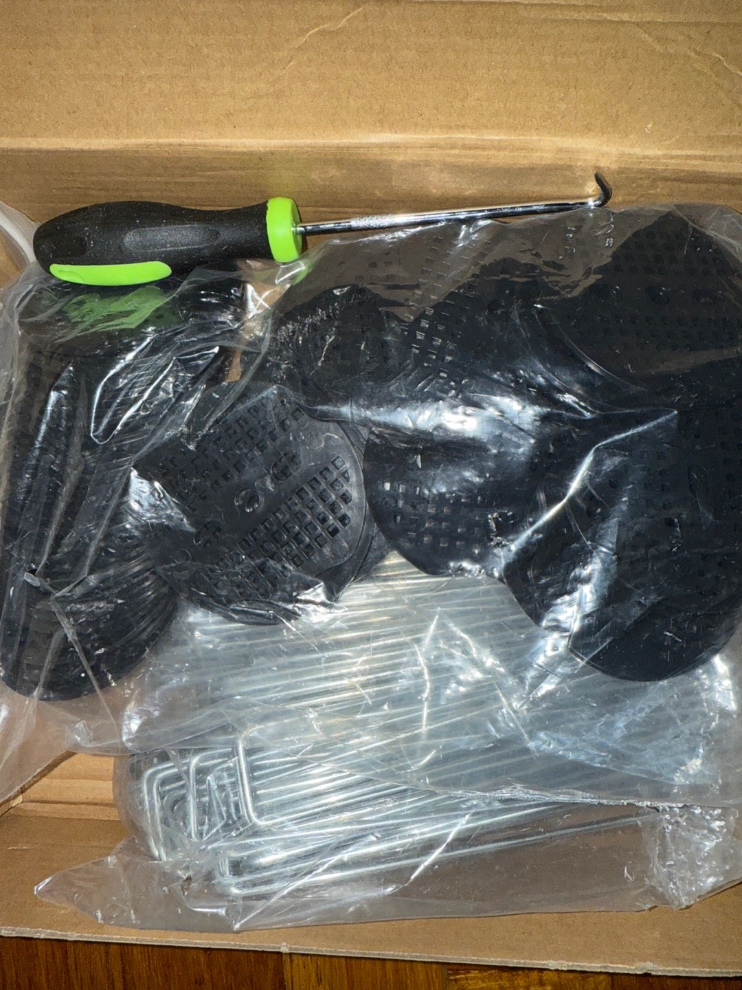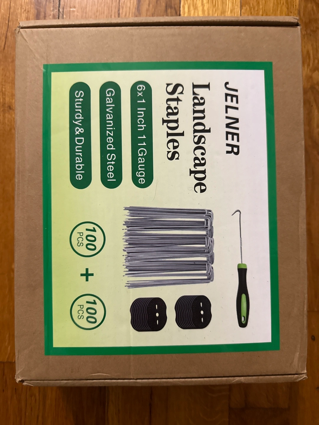 New, unopened box of JELNER landscape staples. Includes 100 galvanized steel 6x1 inch staples, 100 plastic landscape staples, and installation tool. Sturdy and durable.
