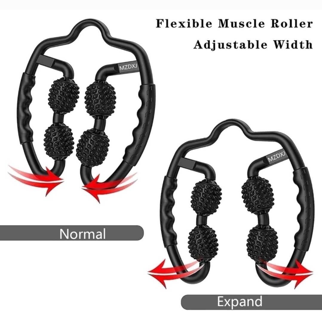 Flexible muscle roller with adjustable width. Ergonomic handle, anti-slip texture. Great for back, neck, arms and legs. Mimics a massage therapist's touch.