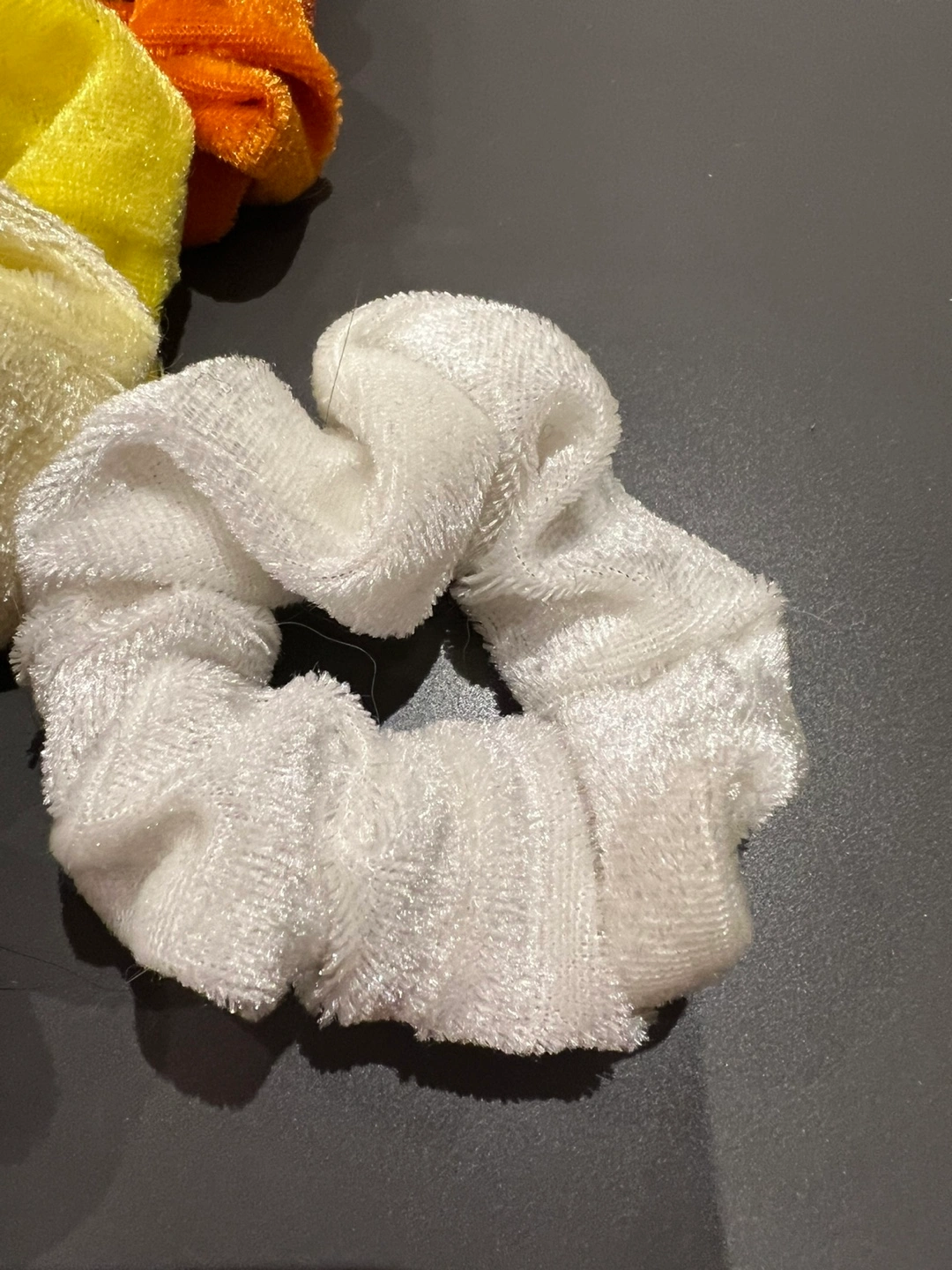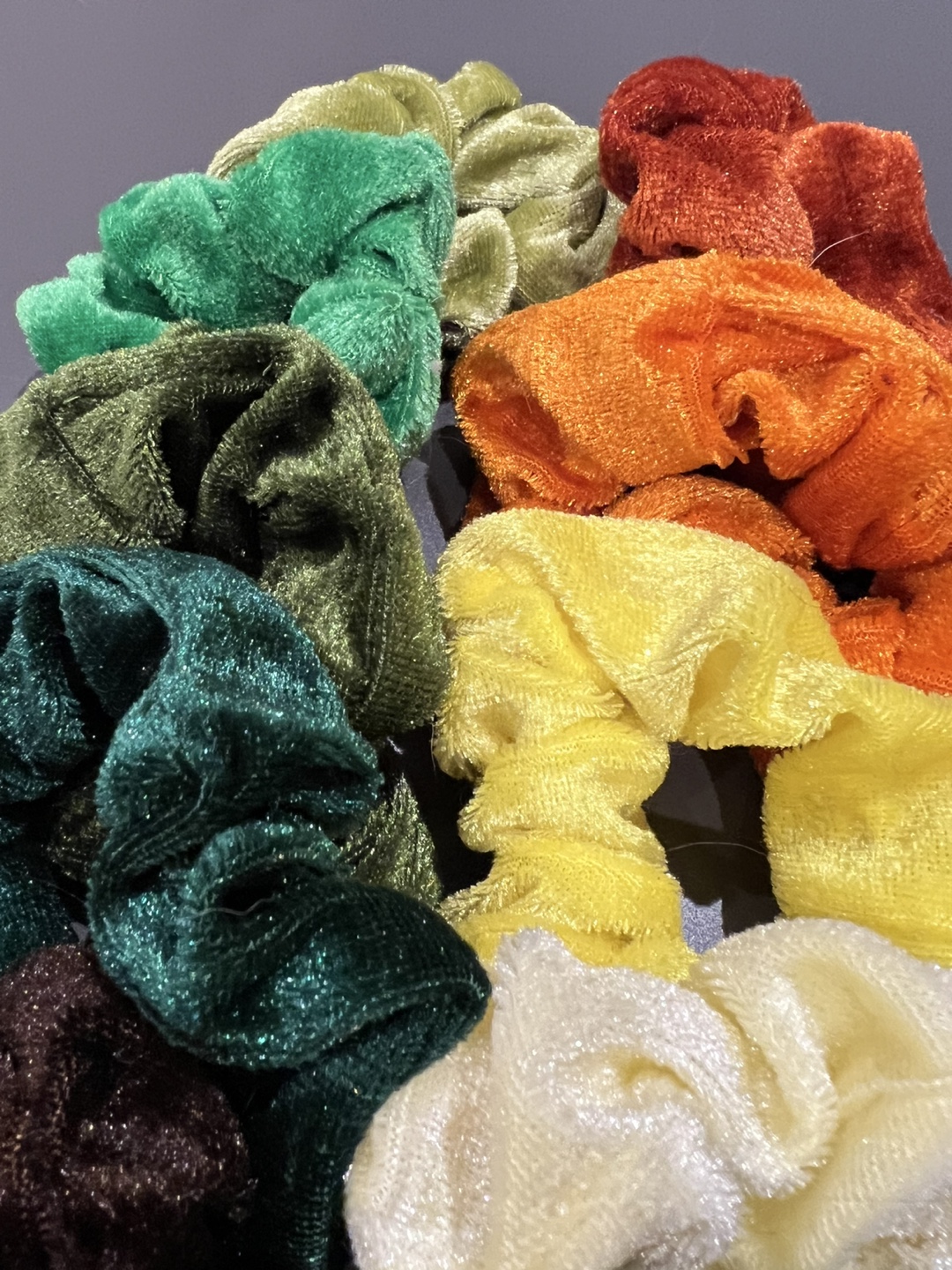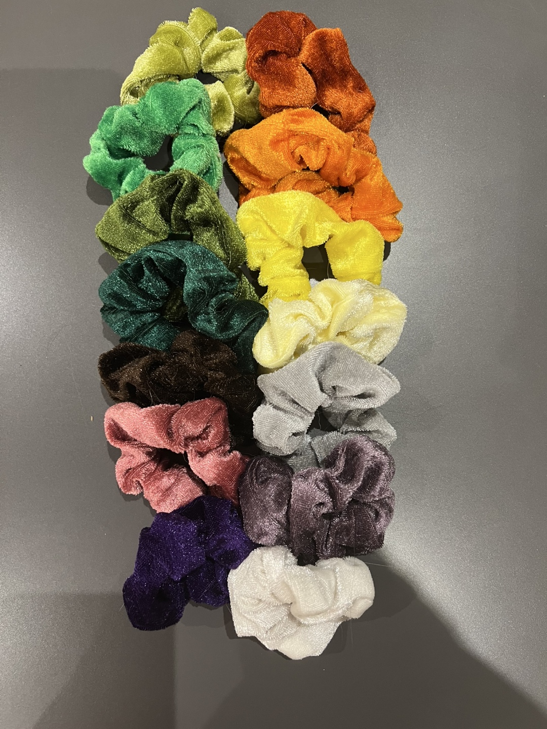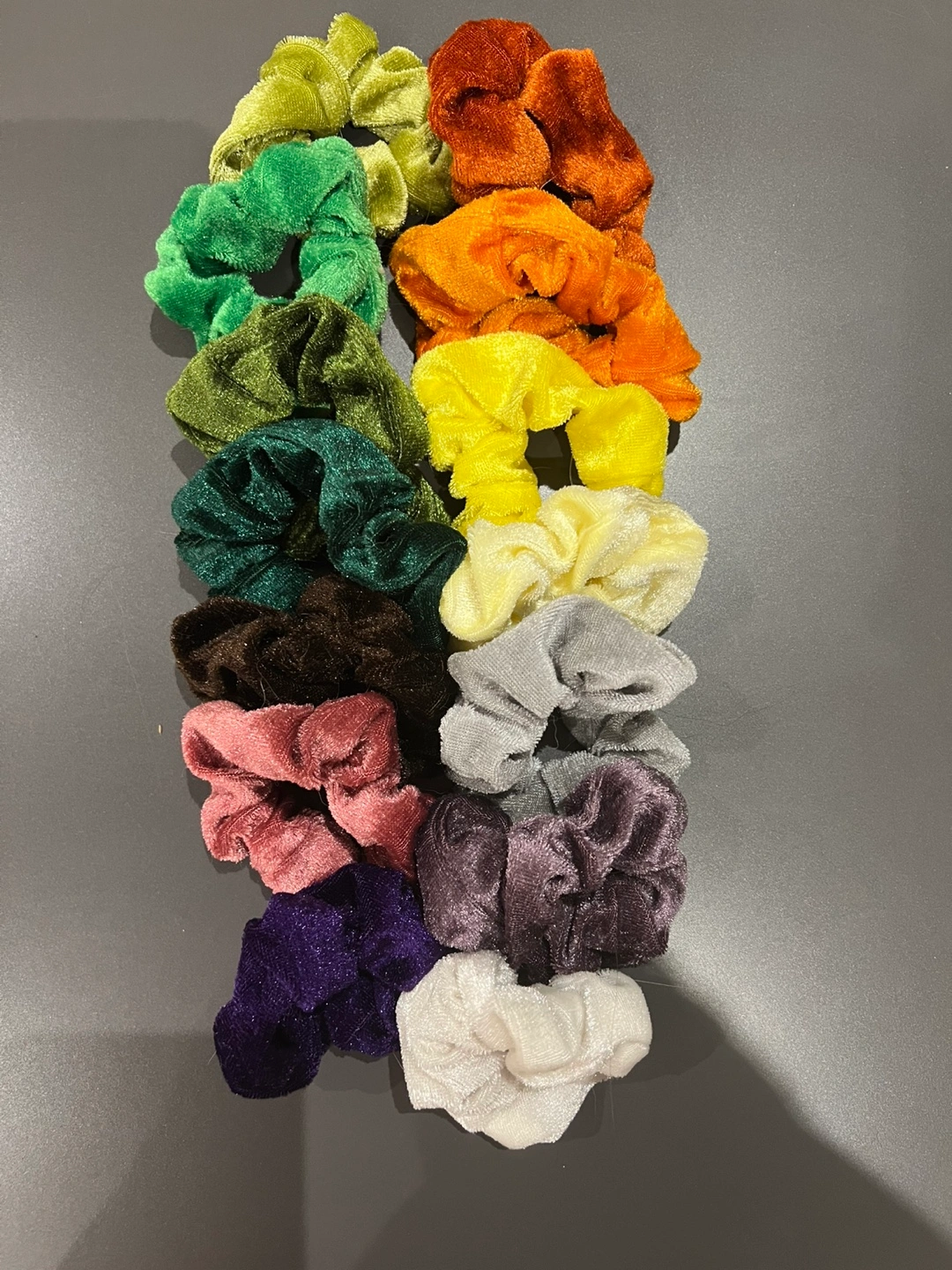 Set of various colours of velvet scrunchies. Soft and stretchy.
