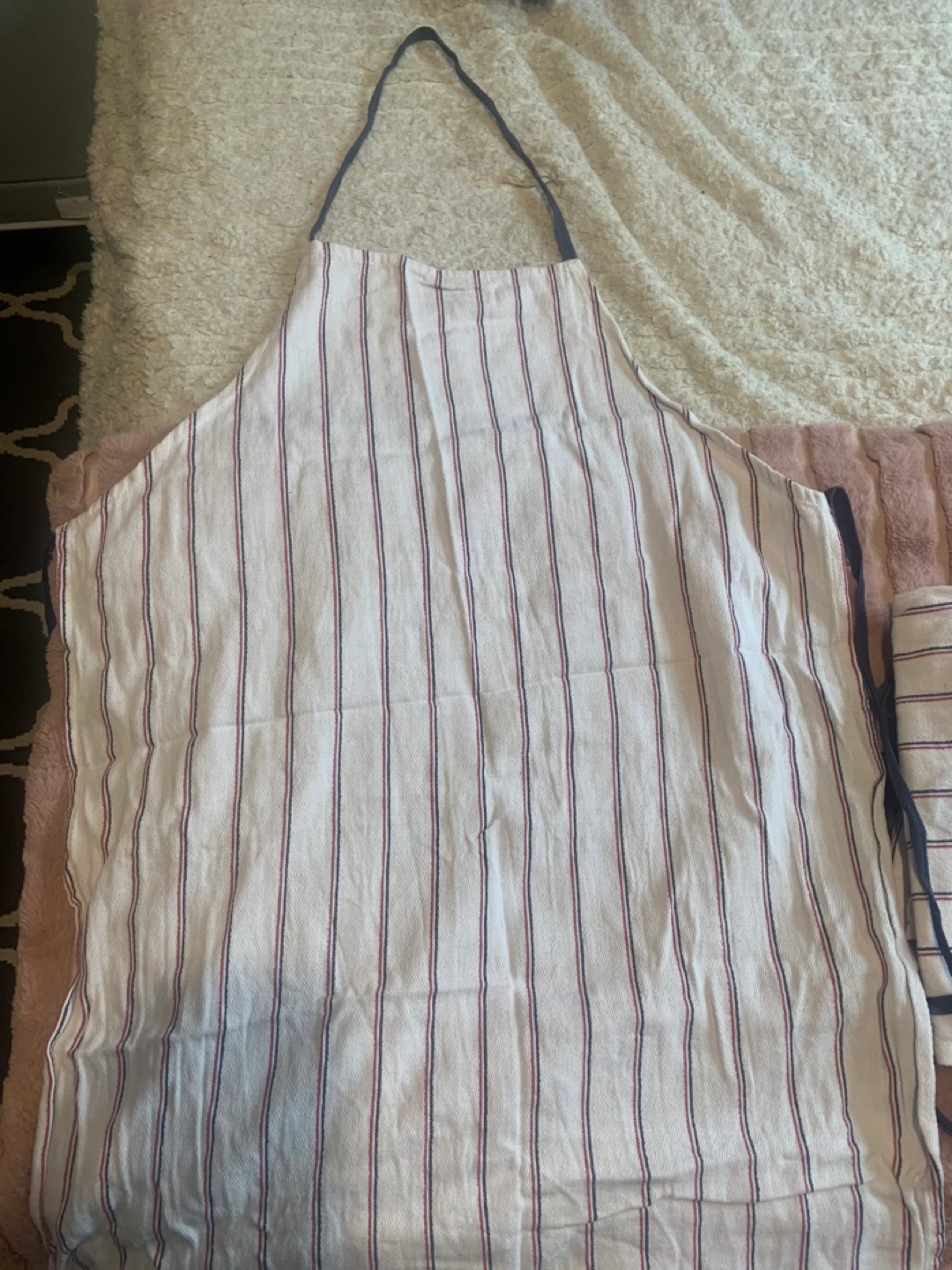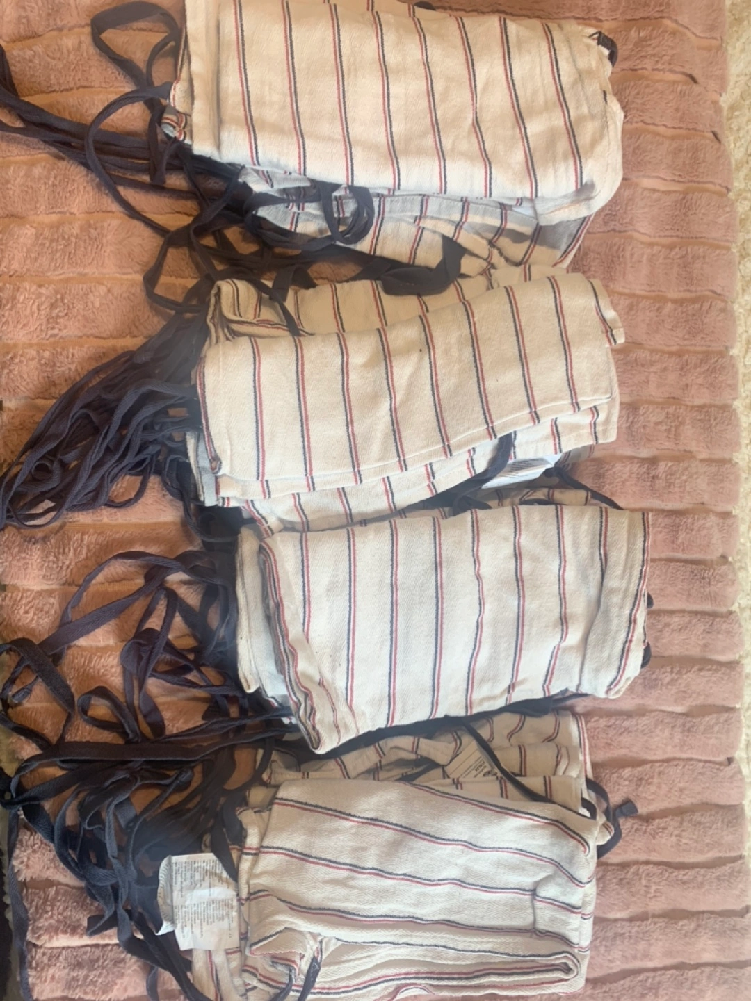 PRICE LISTED OR BEST OFFER 9 aprons like new, used only once. 100% cotton fabric. Adult size. Striped pattern in cream, red, and navy. Dark blue straps. Pick up only, no deliveries. Great for arts and crafts classes or just working around your house: cooking, gardening, etc.