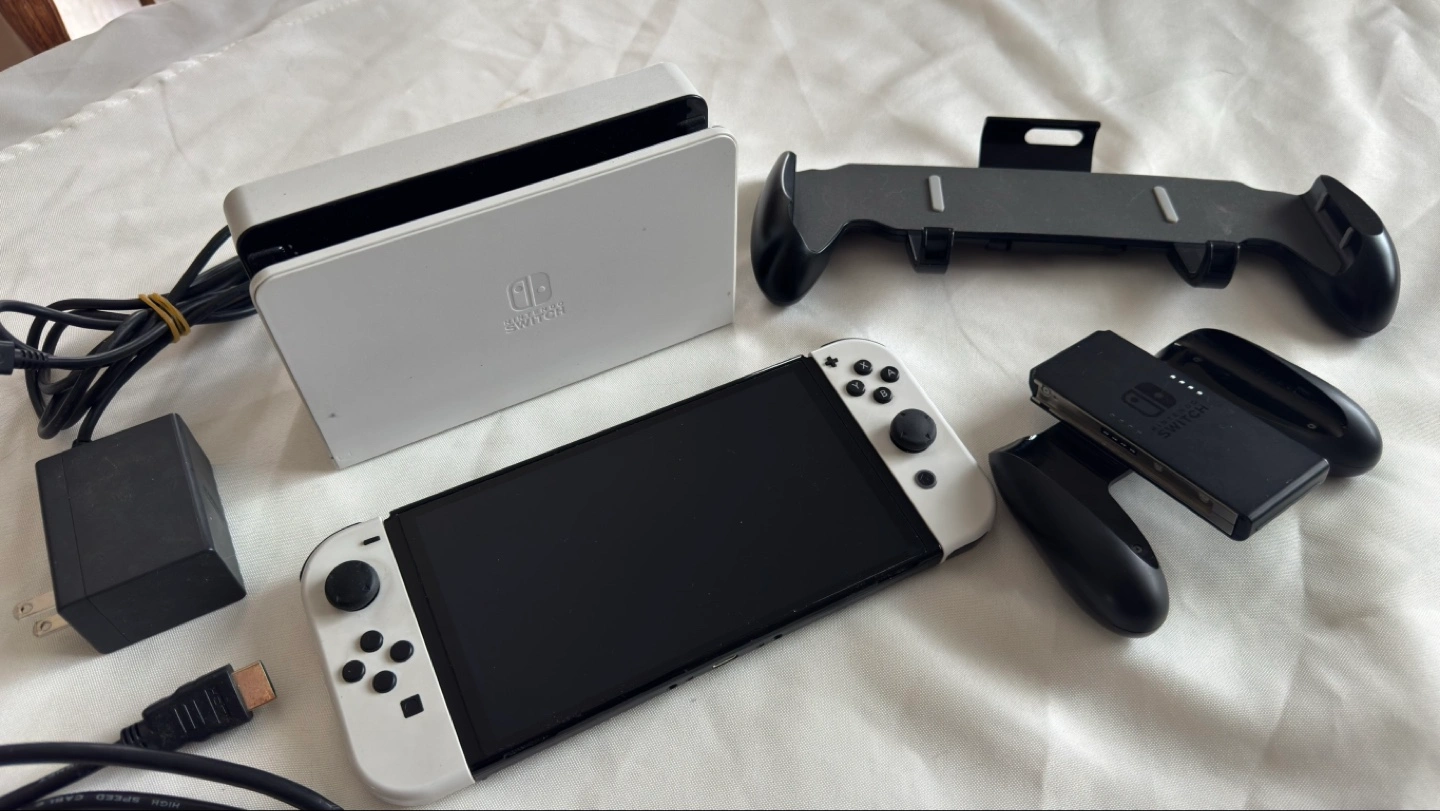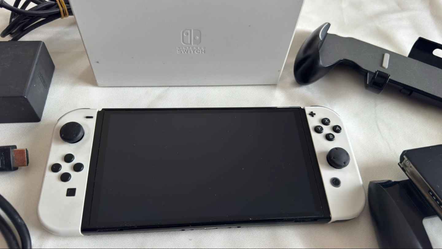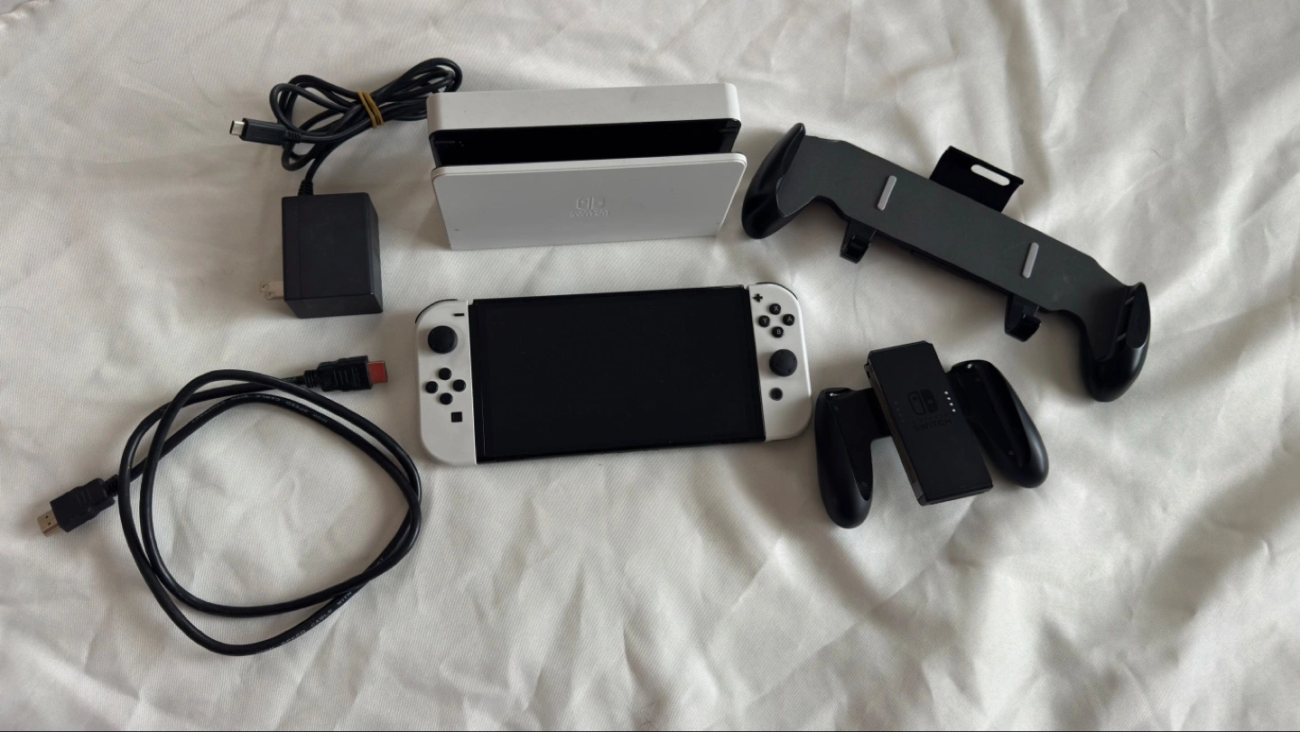 Nintendo Switch OLED console, white colour. Includes docking station, HDMI cable, power adapter, and Joy-Con grip.Barley Used, but in good condition. Great for gaming on the go or on your TV.