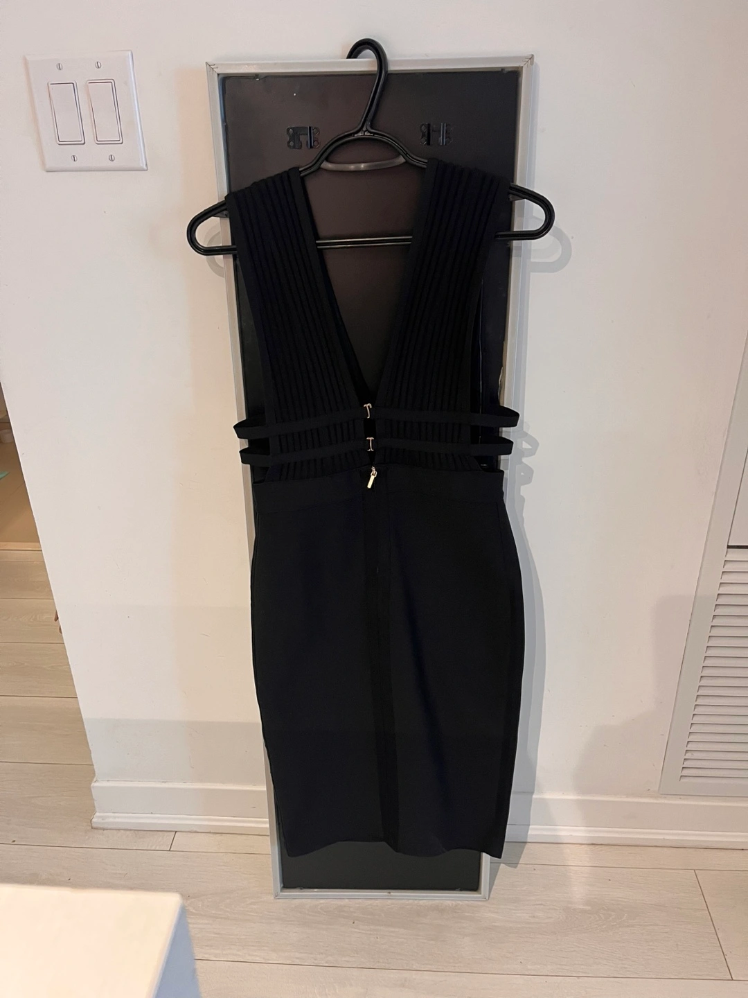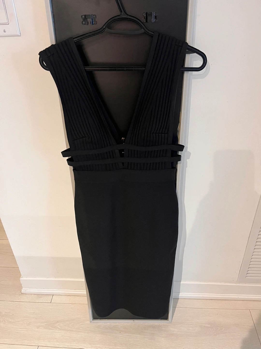 Stunning black midi dress. Features a V-neckline, pleated bodice, cutouts at the waist, and a form-fitting silhouette. Zipper closure at the back. Perfect for a night out or special occasion.