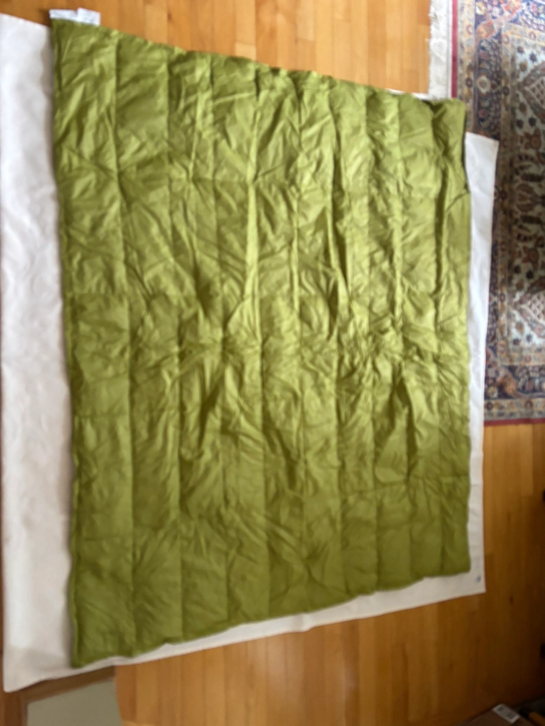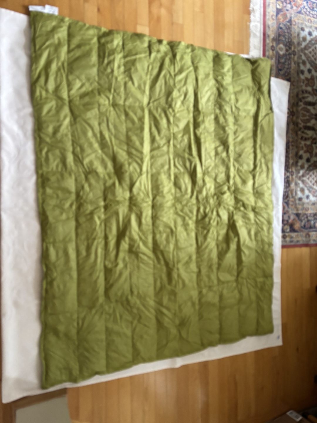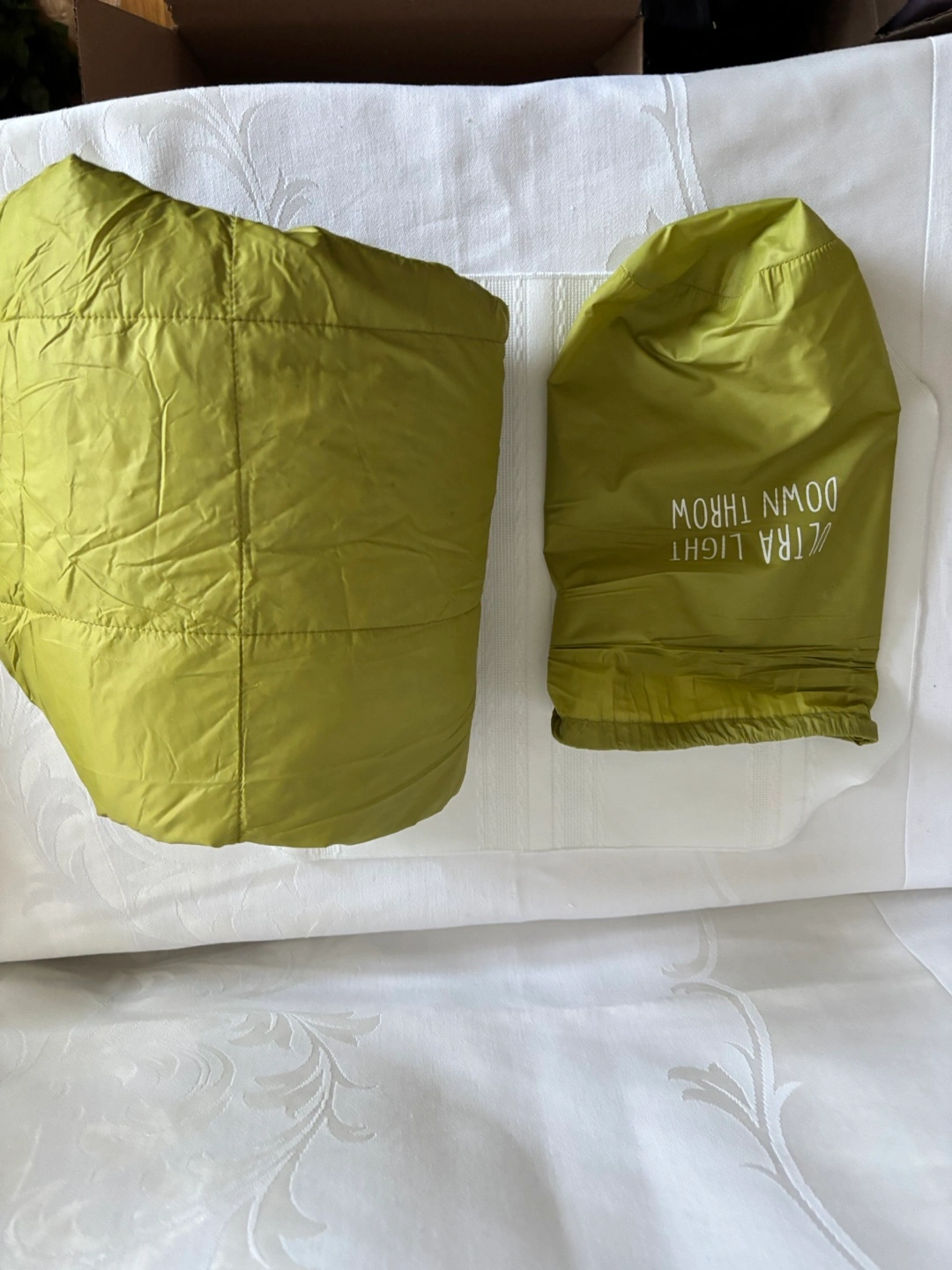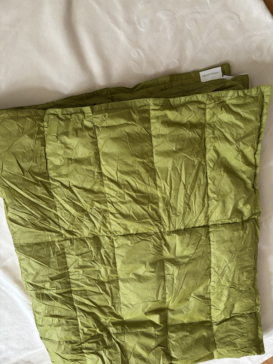 Down filled light throw blanket- perfect for travel or camping- use as extra warmth lining for sleeping bag. Size 4x5 feet - Weight 13 oz or 375grams- washable
