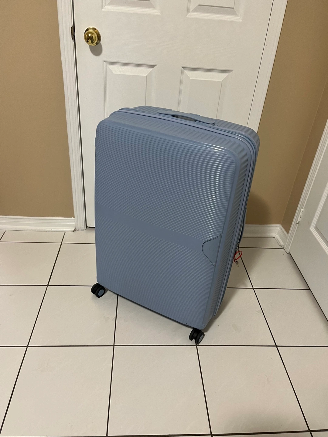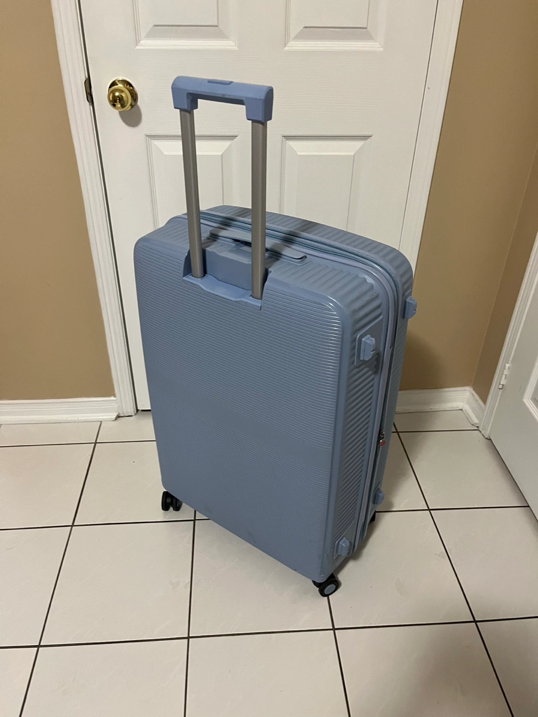 Large spinner suitcase, light blue colour. Features multiple compartments and a retractable handle. Durable hard shell.