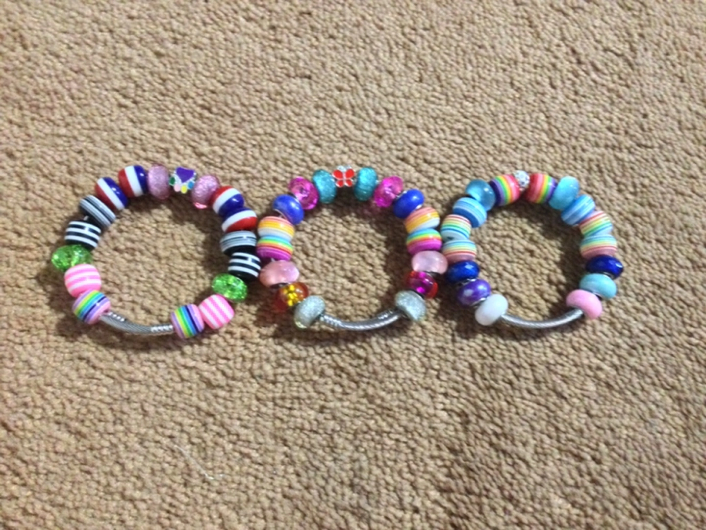 194Set of three bracelets. Each features colourful beads and a metal band. Great for kids or collectors.