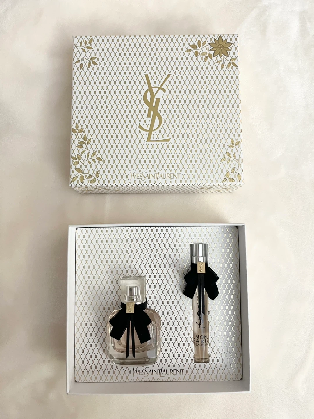 Mon Paris gift set featuring two perfumes: 30ml bottle (sprayed only 3-4 times) and 10ml travel spray (brand new). Retail price of 30ml is about $115 and 10ml is $46 at Sephora. It would be $160-$180 for this gift set. I’m selling it for $130.