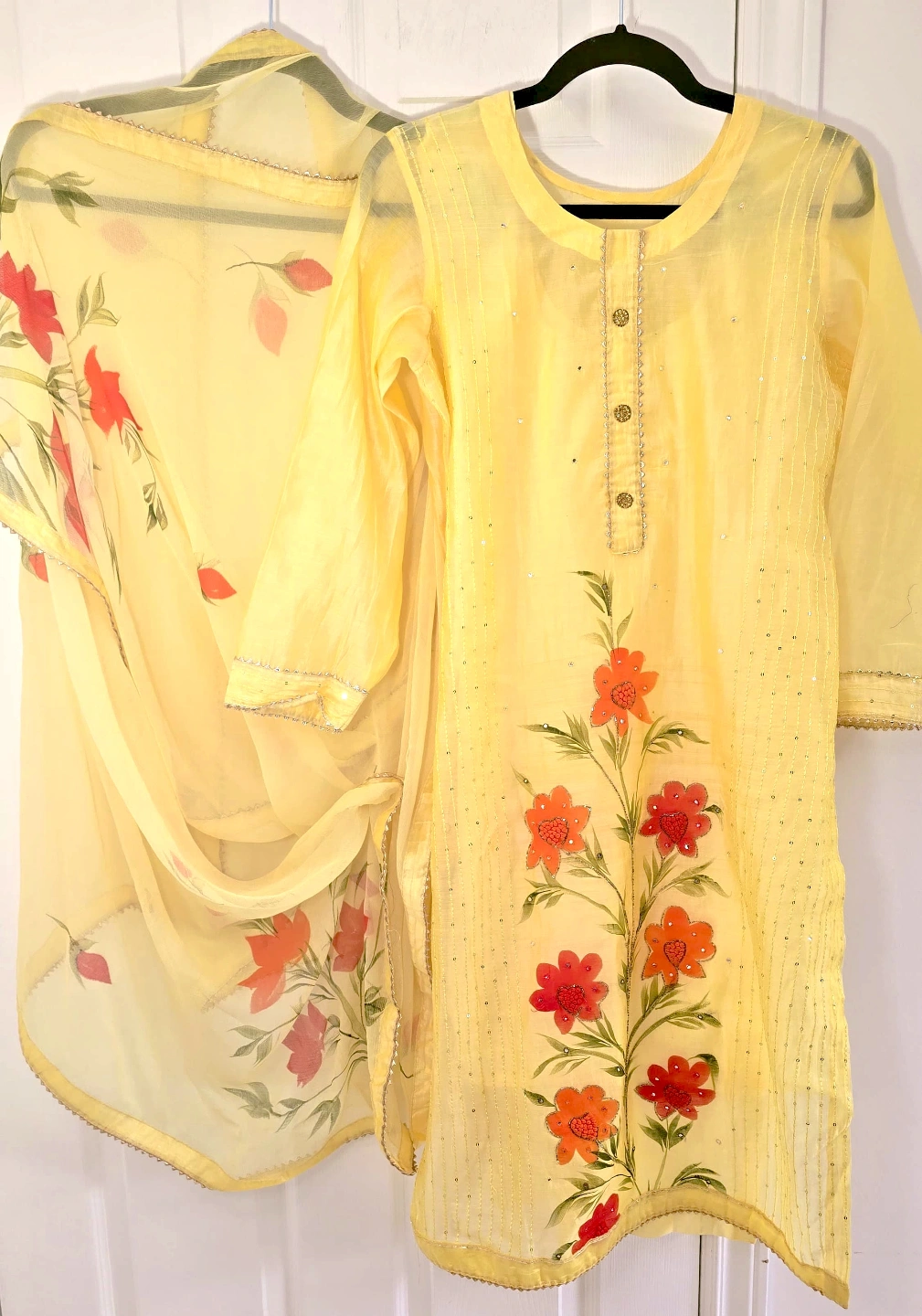 Beautiful Paint Print with sequins yellow salwar kameez. Features orange and red floral design. Three-quarter sleeves. Includes matching dupatta. Lightweight fabric, perfect for warmer weather.