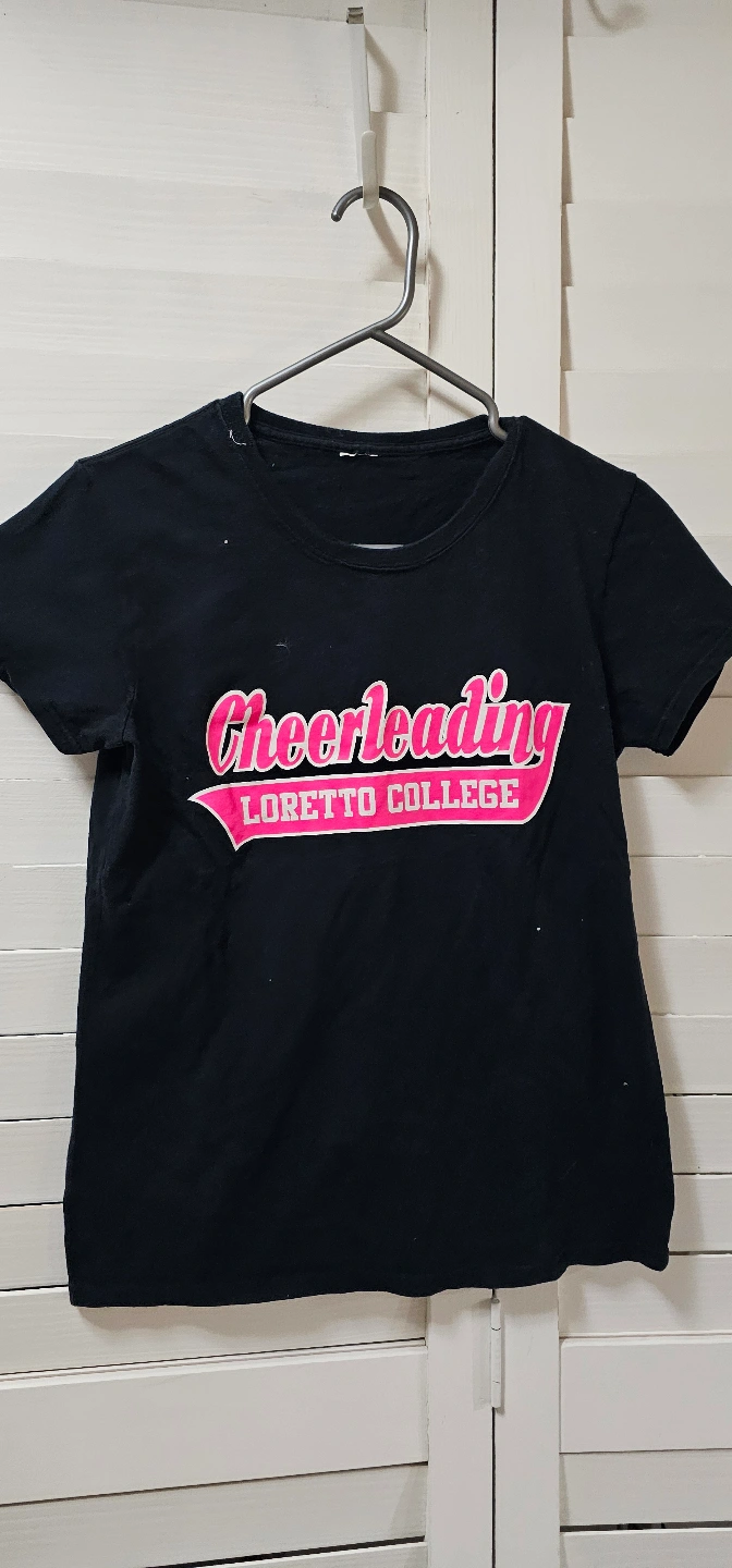 Black t-shirt. Short sleeves. One features 'Cheerleading Loretto College' in pink lettering. Another features a small pocket and 'ACEM12' on the back in pink lettering. Size XS. Measurements in inches are approximately: width 14, length 18, shoulder to hem 26.5.